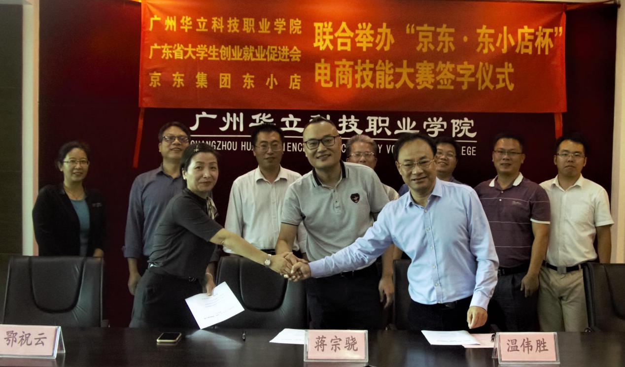 2020年10月11日下午,广州华立科技职业学院举行校企合作签约仪式。广东省大学生创业就业促进会会长蒋宗骁,京东集团东小店精英店长、广州城市推广大使鄂祝云;我校党委副书记、副校长高尧来,管理学院院长温伟胜、教务处副处长何志宏、校企合作处负责人钟文浩等参加签约仪式。签约仪式由我校校企合作处负责人钟文浩主持。