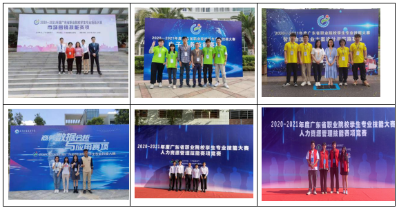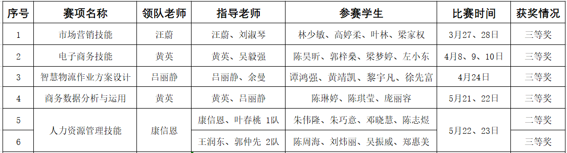 本学年,管理学院共组织10支队伍参加广东省职业院校学生专业技能大赛的8个赛项。由于疫情影响比赛时间延期和未参赛等原因,管理学院有6支队伍都获得了比赛名次,四个专业都有获奖,其中二等奖1个,三等奖5个,具体情况见下表: