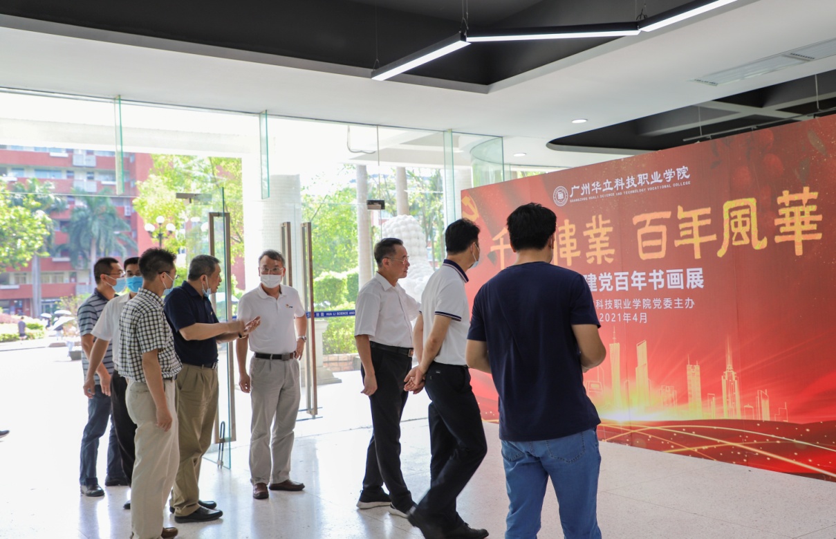 会后,巡回指导组参观了校园,到图书馆观看了“千秋伟业、百年风华——庆祝建党百年书画展",对我校党建宣传氛围、校园文化环境及党史学习教育开展形式与成效给予肯定。
