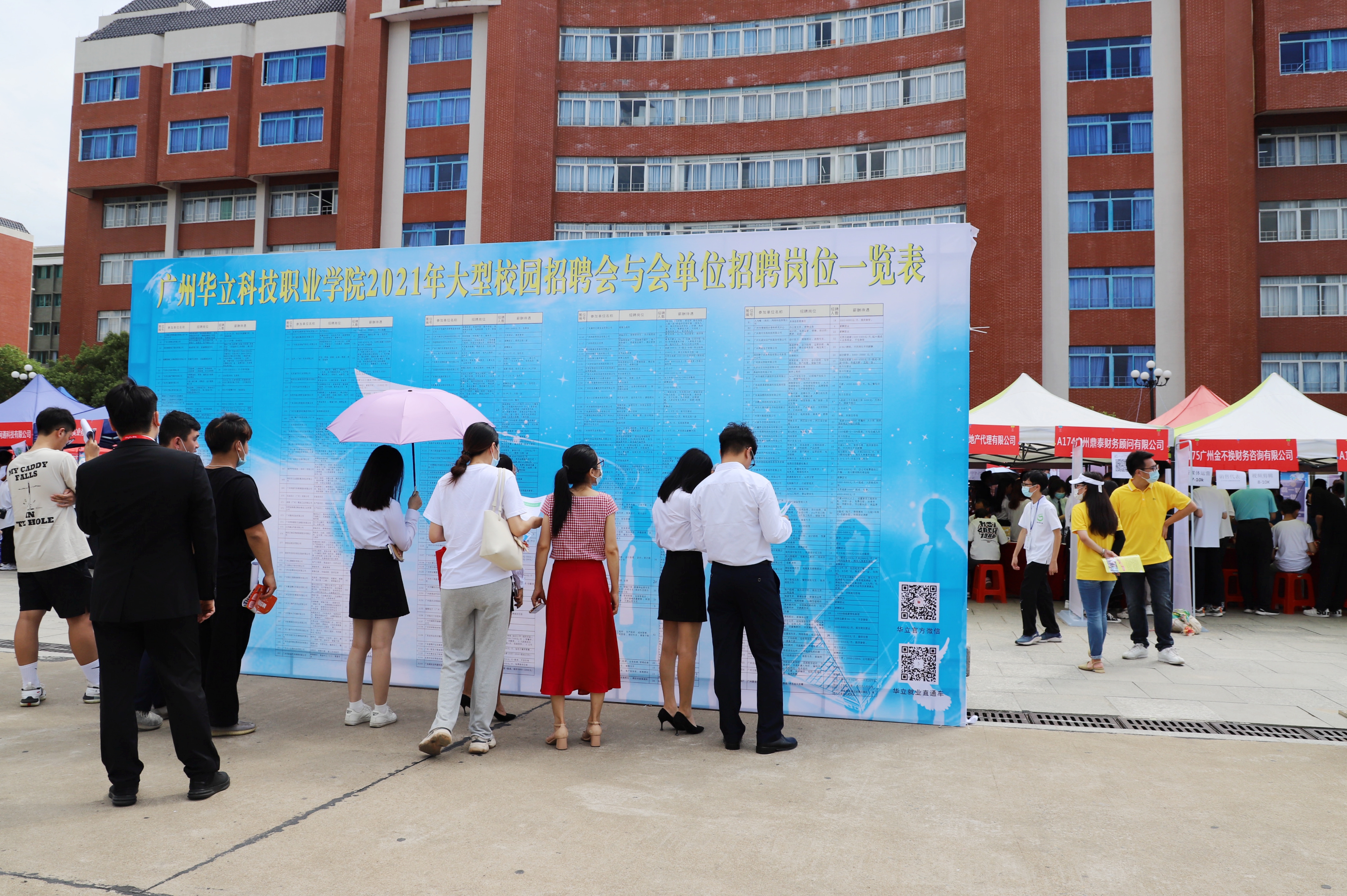2021年5月26日,阳光明媚风和日丽,由我校主办,增城区人力资源和社会保障局协办的“广州华立科技职业学院2021年校园招聘会”在学校综合楼广场和图书馆前广场如期开幕,是检验华立人教学成果的年度盛会。本次招聘会吸引了中国联通广州公司、福耀玻璃、北汽集团、比亚迪、百度广州分公司、京东、顺丰、深圳顺络、中天建设集团等在内的大湾区名优企业、上市公司、行业领头羊等250余家企业提供了10000多个实习就业岗位,为学生提供了丰富的实习就业选择。