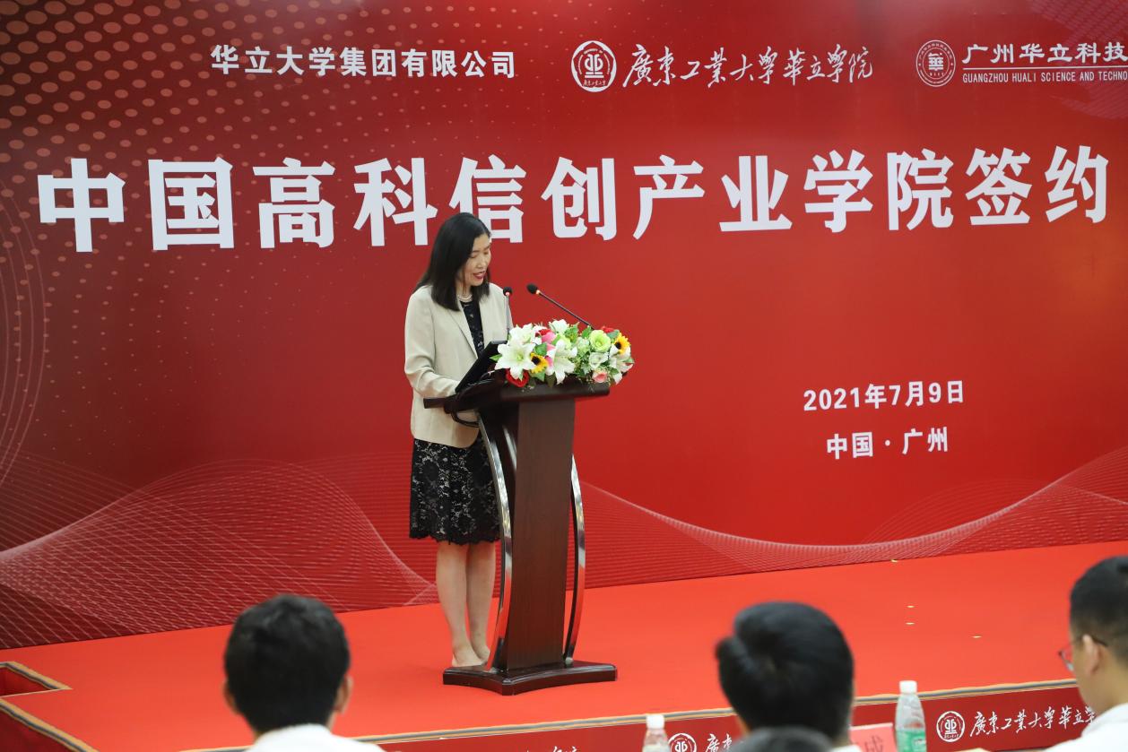 中国高科集团总裁朱怡然发表致辞,向积极促成此次合作的领导与嘉宾表达了诚挚的感谢,并对“中国高科信创产业学院”的前景寄予充分的期待。在校企合作、培育人才的过程中,中国高科集团始终紧密贴合《现代产业学院建设指南(试行)》中有关“要建设若干与地方政府、行业企业等多主体共建共管共享的现代产业学院”、“推动学校人才培养供给侧与产业需求侧紧密对接”、“引导行业企业深度参与教材编制和课程建设,设计课程体系、优化课程结构”等要求,与院校联合进行深度产教融合下的专业人才培养。朱总裁表示,中国高科信创产业学院是中国高科集团与华立大学集团院共同努力下的硕果,是多层次联合教学,多专业交叉复合,专业集群支持产业集群发展的一次大胆尝试,也是院校端、企业端、产业端携手深化产教融合的必然结果。中国高科集团希望能够与华立大学集团强强联手,助力华立的教育发展,为大湾区专业人才培养提供创新思路和发展范式,实现发展共赢。