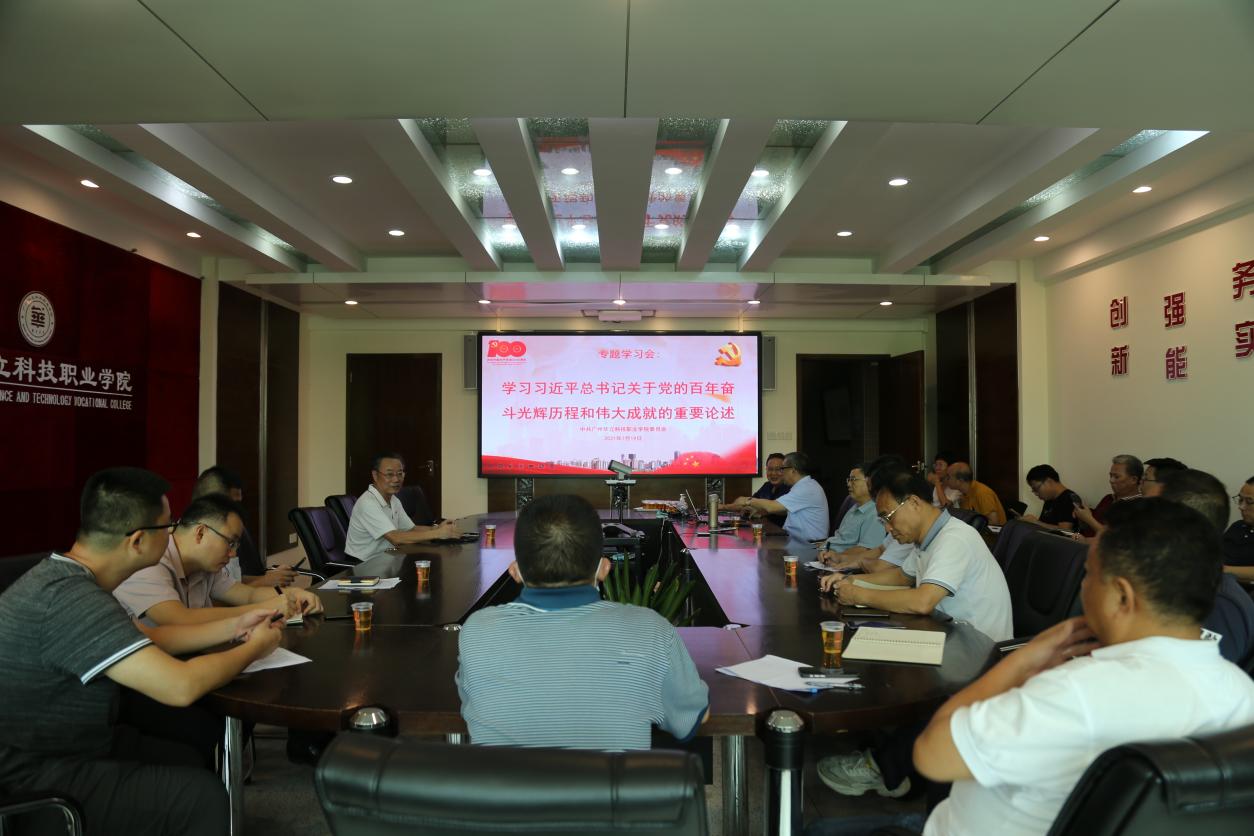7月19日下午,广州华立科技职业学院党委在行政楼305会议室召开专题学习会,学习习近平总书记“七一”重要讲话中关于党的百年奋斗光辉历程和伟大成就的重要论述,学校党委委员、校领导、中层干部、全体党务干部、思政教师参加了会议。