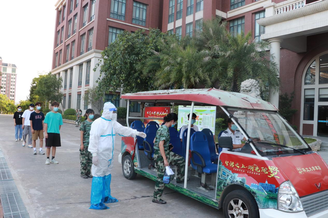 市转移隔离专班安排的转运车辆到达学校,准备分批转移密接者、次密接者和重点人员至隔离酒店。师生登车前,医护人员给师生测体温、指导戴好口罩(纠正不正确的佩戴方式)、询问症状。学校核对全部待转运人员信息确定无误后,各引导员引导学生有序上车,并按规定座位间隔坐好。随车医生提醒师生要全程佩戴口罩不要摘下,避免交谈,不要串座。校方委派志愿者随车前往隔离酒店,协同酒店管理隔离的师生。