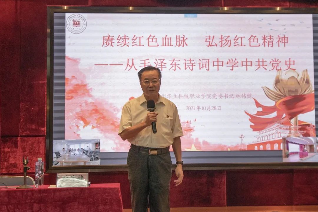 10月28日下午,广州华立科技职业学院党委书记林伟健教授在东区1号报告厅讲授“思政第一课”,解读毛主席诗词,领悟由建党精神构建的中国共产党人的精神谱系及诗词中蕴含的红色精神,要求华立学子秉承革命先辈遗志, 弘扬红色精神,践行初心使命,树立为党为国为民永久奋斗、赤诚奉献的坚定理想。学校全体党务干部、思政教师、入党积极分子和学生参加学习,云浮校区师生在线上参加会议。省教育工委党史学习教育第七巡回指导组成员以视频方式参会指导。