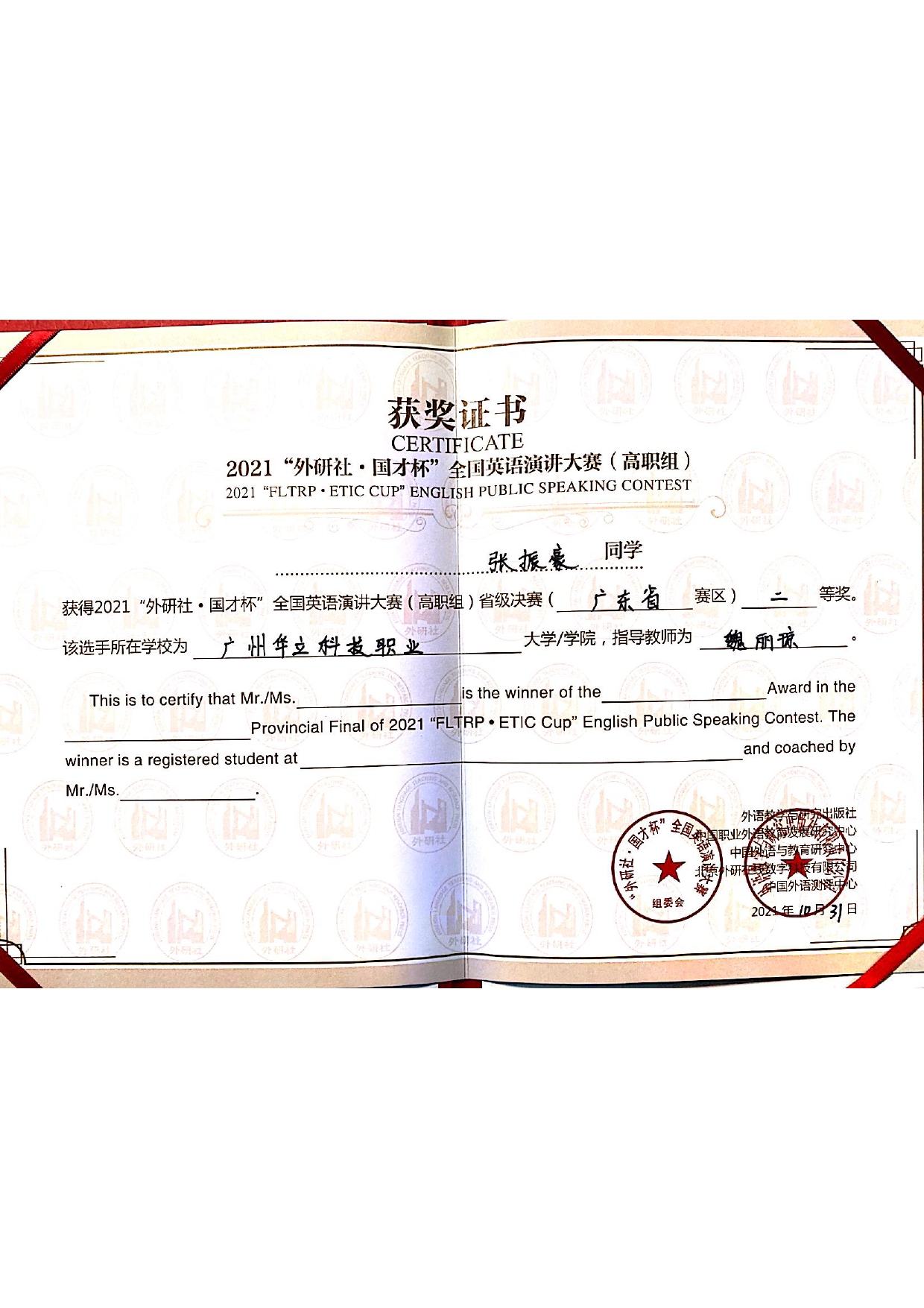 张振豪同学获2021“外研社·国才杯”全国英语演讲大赛(高职组)省级决赛(广东赛区)二等奖