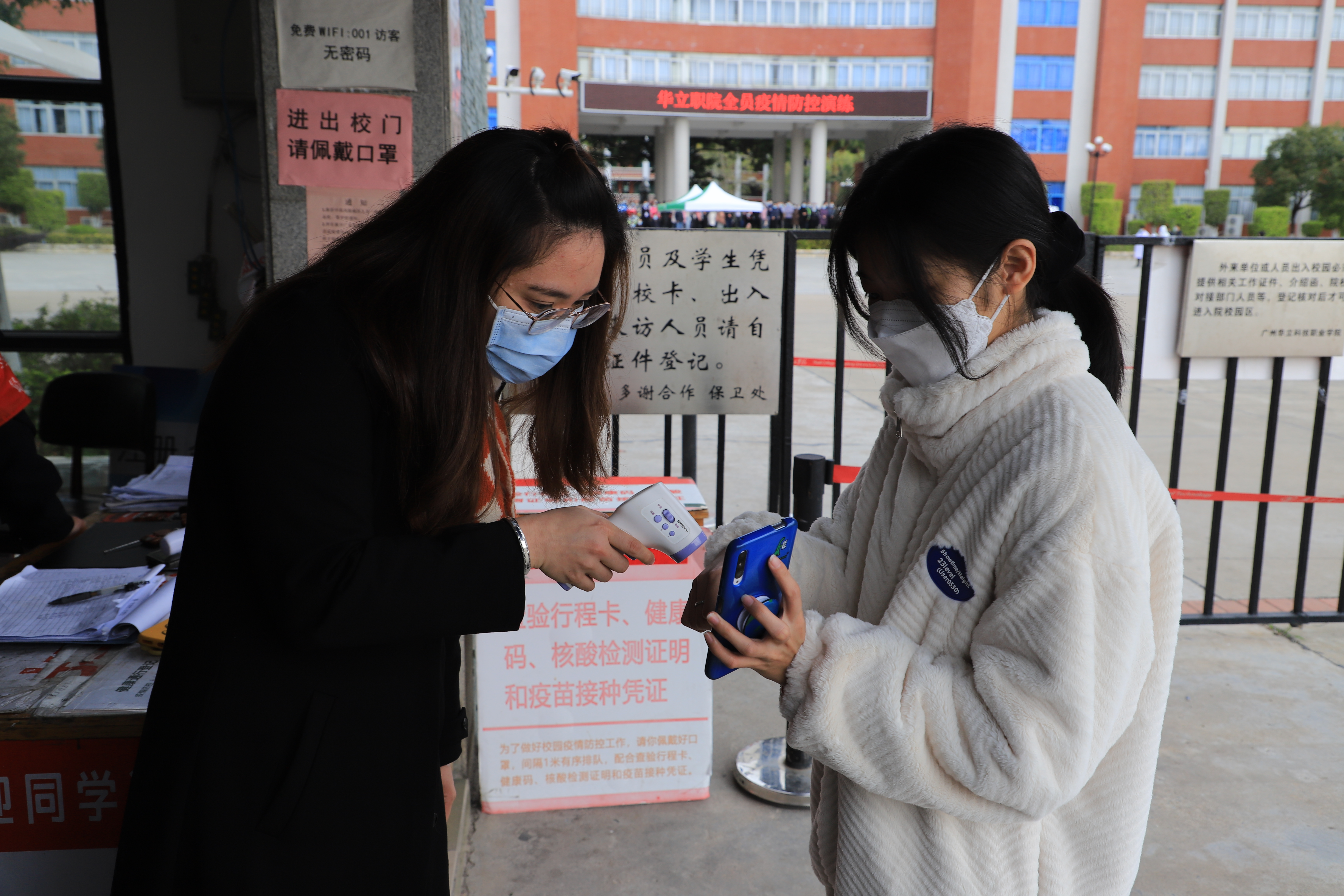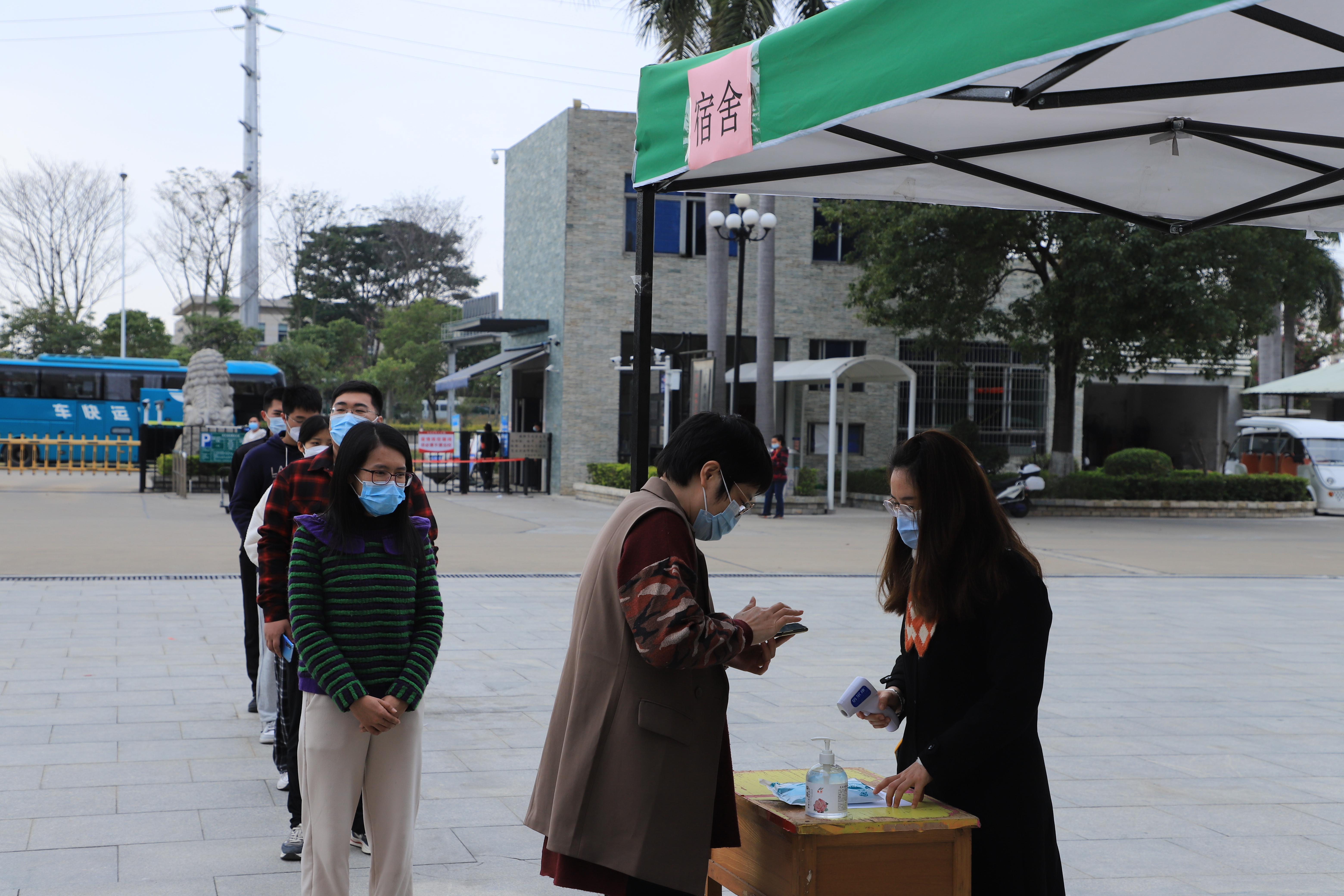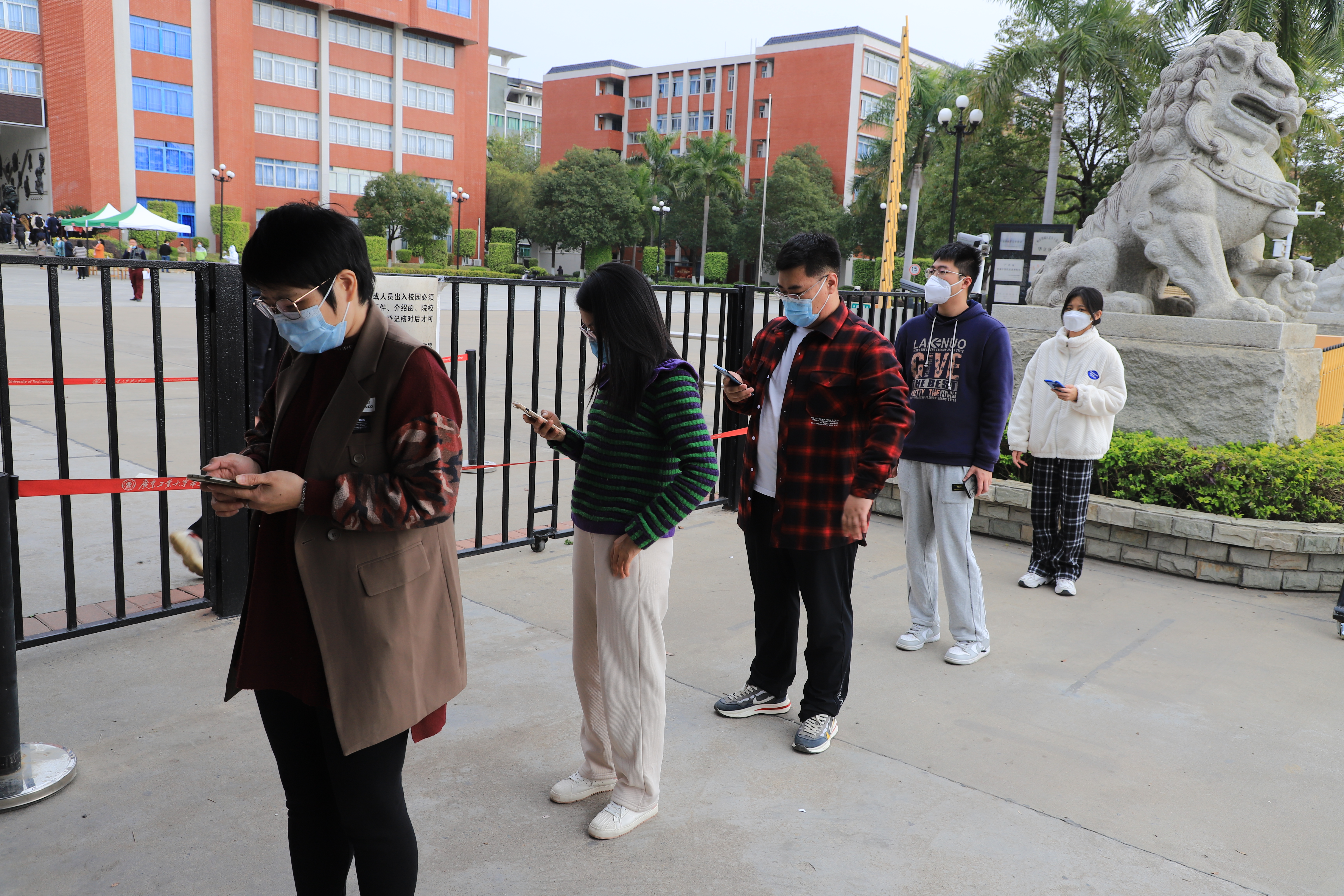 首先出示穗康码或粤康码进行查验,确认已关联学校身份及无异常后,进入第二个环节体温监测(监测体温异常由专门人员安置校门口临时观察区,启动应急程序),体温监测正常后,进入第三个环节进行健康码、行程码、核酸报告排查登记,在使用消毒免洗液洗手后,按规定通道进入学校。