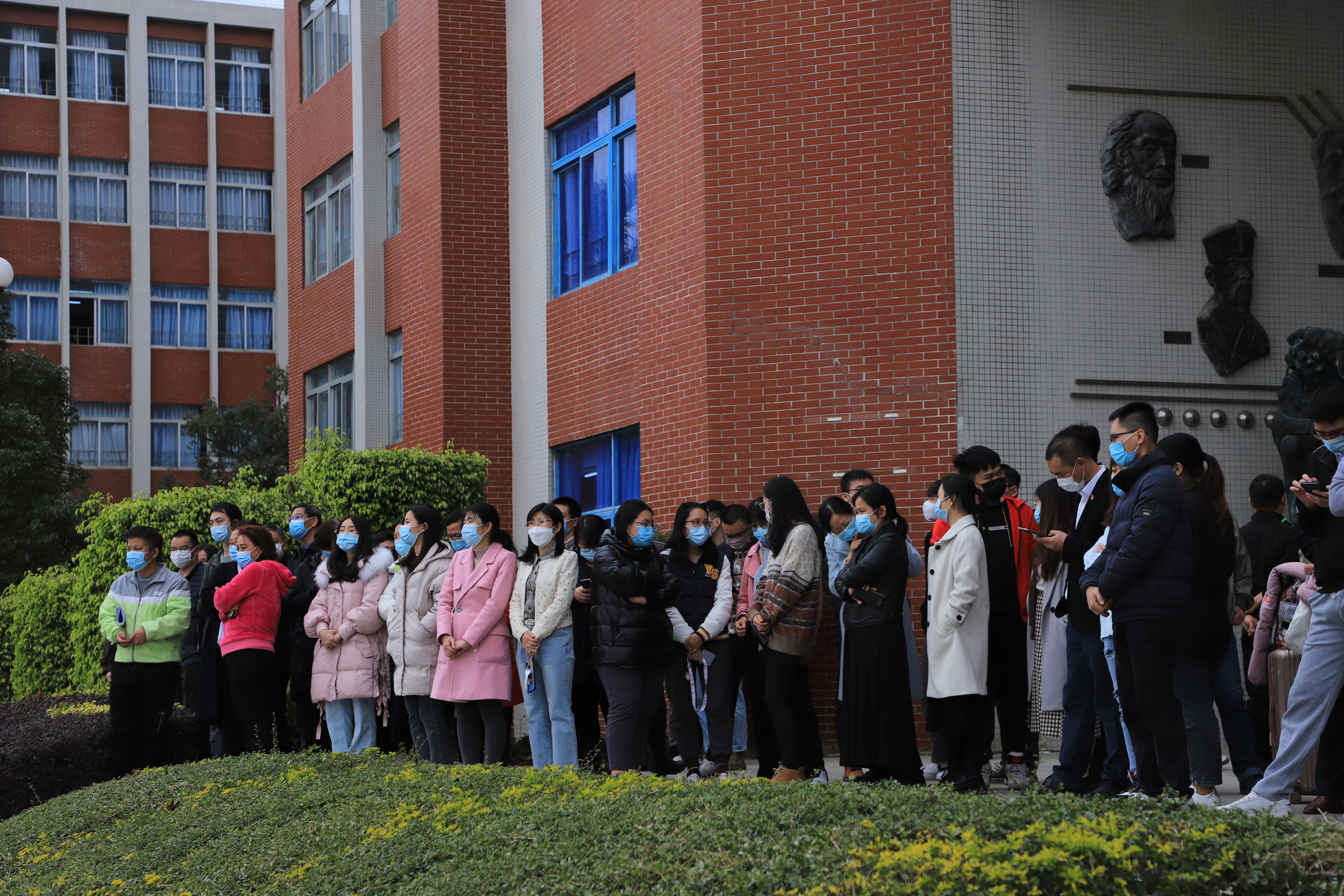 返校在校门口行李消毒后排队检查入校:间隔1米排队,增江派出所民警、学校安保人员及志愿者现场维护秩序,学校保卫处老师协助配合。
