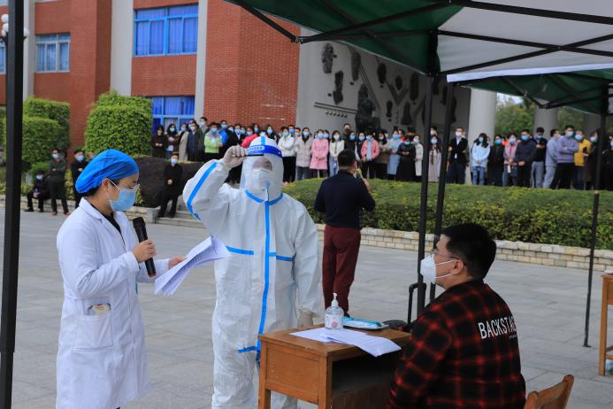 学生宿舍定时进行晨午检及病情监测,工作人员或志愿者上门对宿舍在住人员进行体温检测登记并问询宿舍内人员是否出现异常不适症状。