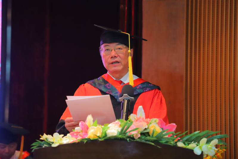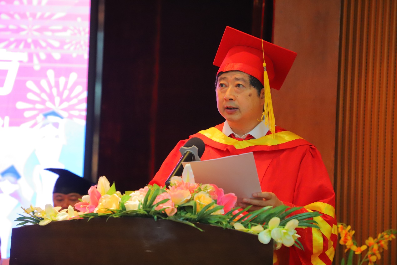 校长易健民教授致辞寄语毕业生。他殷切希望同学们充分利用学习资源,把学习融入到日常生活和工作中,坚持终身学习。坚持学习才能提高技能,坚持学习才能与时俱进,才能适应数字化经济转型。他嘱托同学们不仅要继续学习,更要在实践中提高能力,在实践中求得真知,在实践中提升技能。他认为一项事业,不论大小,都是靠脚踏实地、一点一滴干出来的。未来比拼的,除了知识、技能外将是谁能更好地创新。希望同学们未来要勇于创新,敢于、乐于不断实现自我突破,努力成为数字化转型的能手,为国家建设和社会发展做出应用贡献。