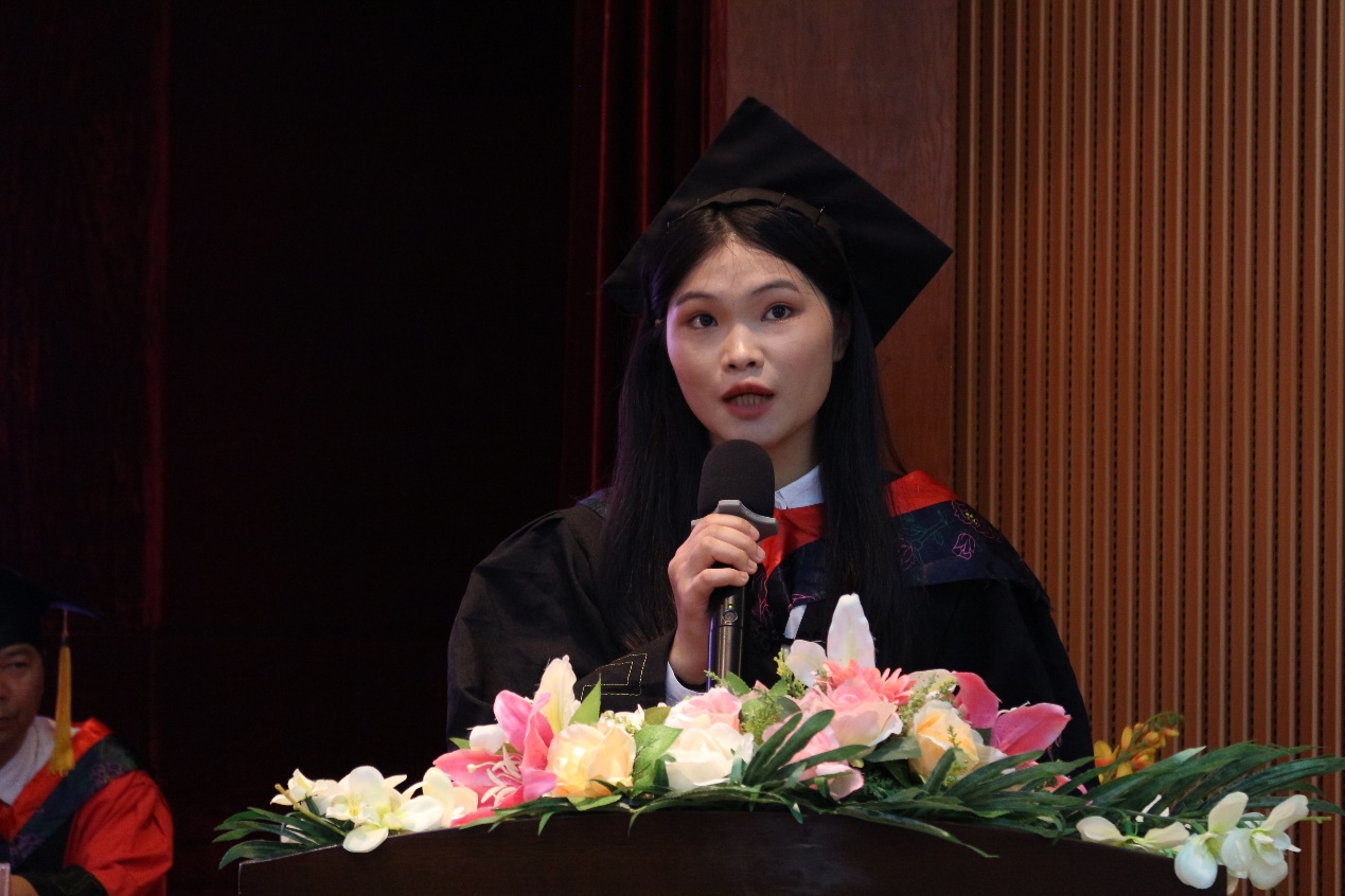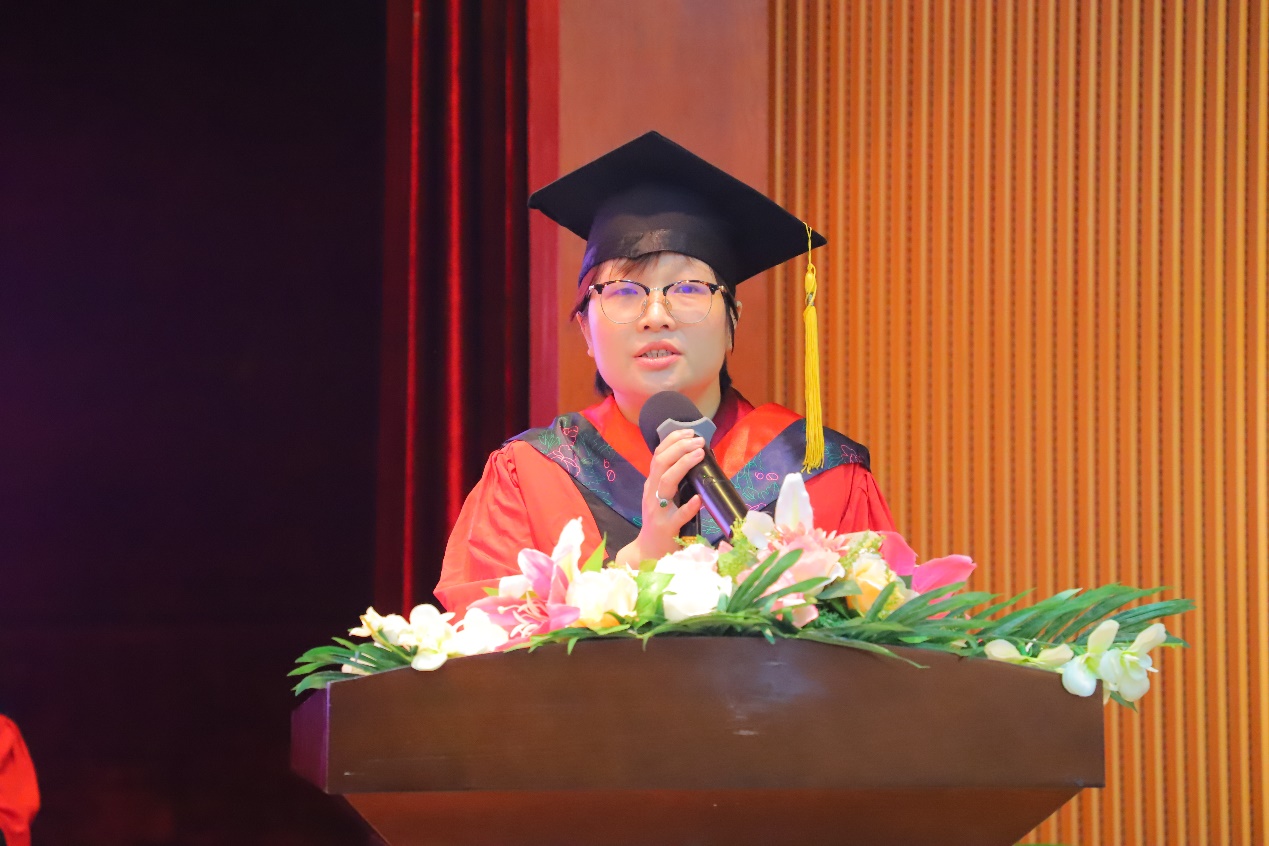 艺术与传媒学院梁宝怡同学代表2022届全体毕业生进行发言。她说到,感谢学校的悉心栽培,为同学们的发展提供的诸多平台和展示的机会,让自己在大学三年里得到了全方面的成长。表示自己会一直铭记“厚德 强能 务实 创新”的校训,并身体力行。青春激昂的发言赢得了现场雷鸣般的掌声。