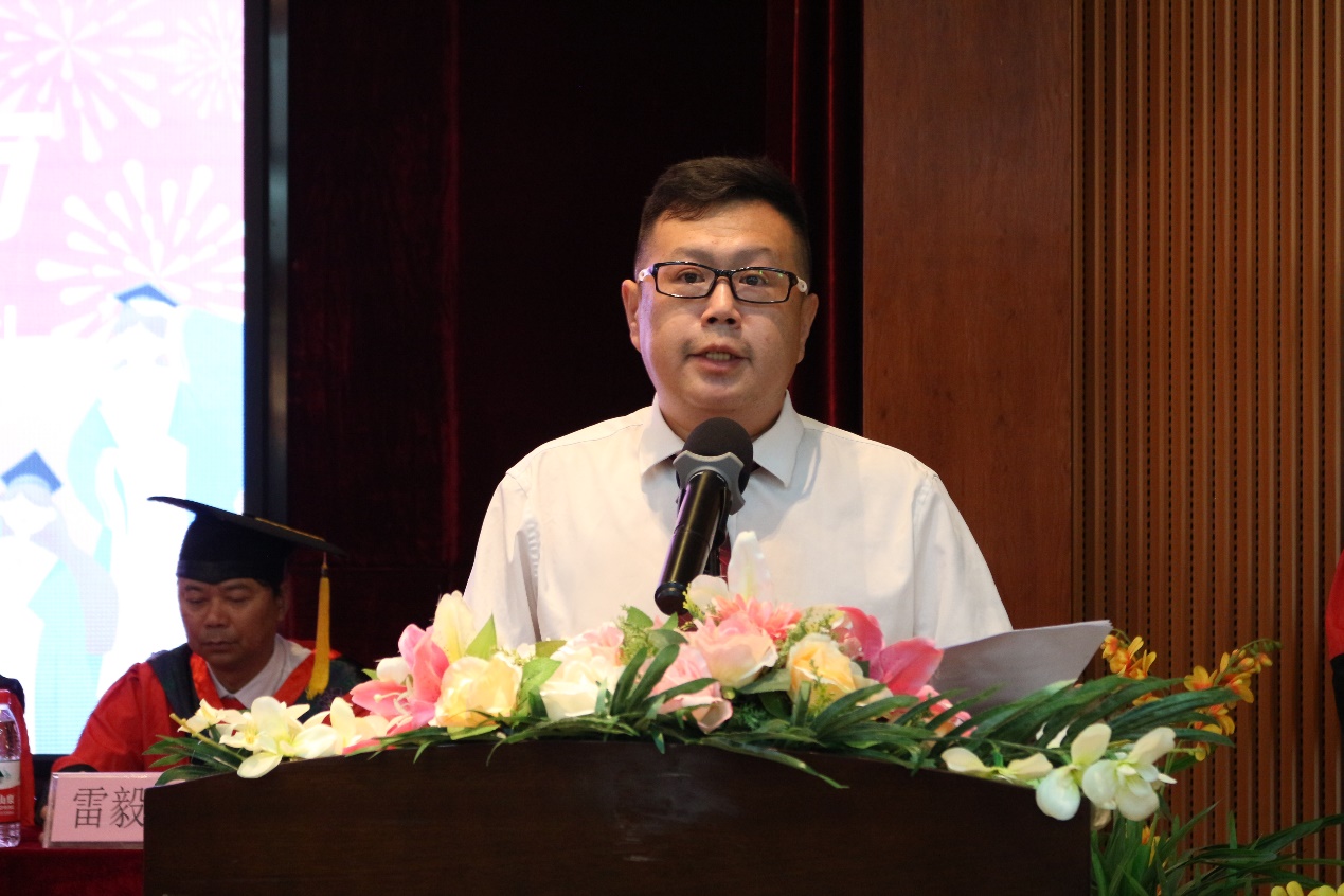 健康学院张邦奎副教授作为教师代表发言。他希望同学们做人要讲诚信,有毅力,不要怕困难,要乐观的看问题、处理事情。建立良好的信心,为家庭和社会,恪守自己的本分;他认为成人比成才更为重要。希望大家一定要经得起考验,要相信阳光总在风雨后。未来技术会更成熟,价值观以及物质条件会逐步完善,具有社会交往能力的会更加精进。希望大家谨记回报国家和为社会做出贡献,认真体会“大国工匠,技术强国”的深刻含义。