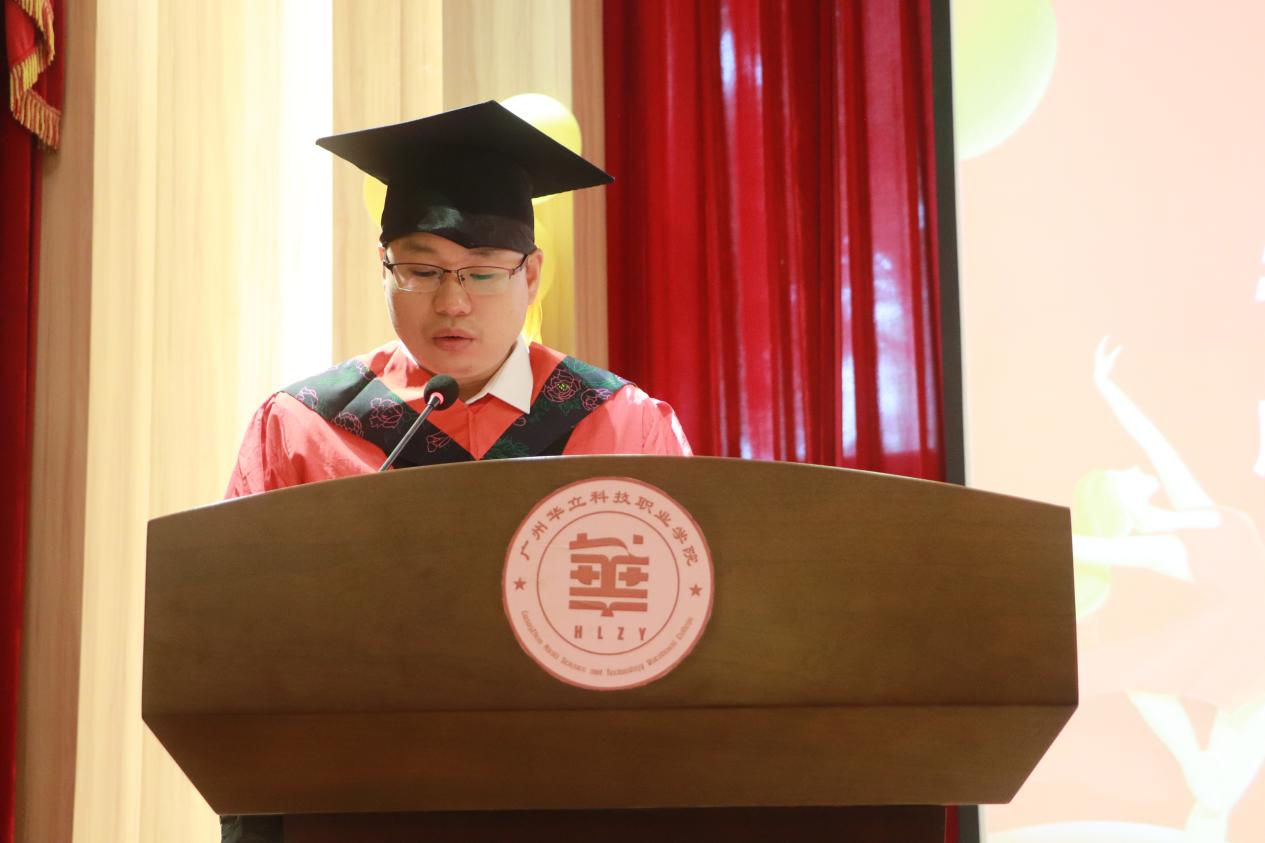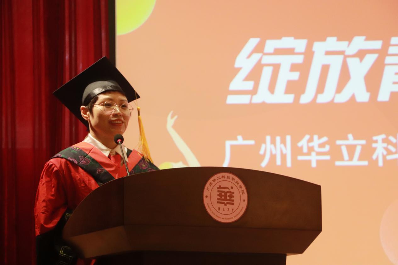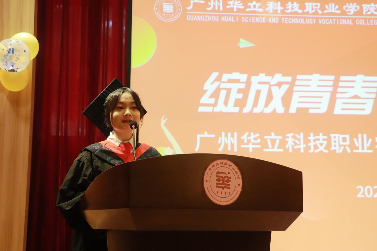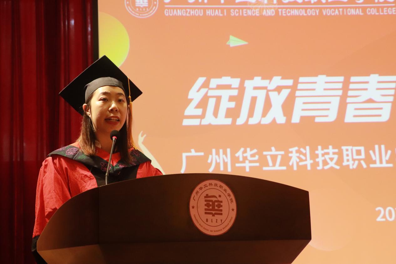 毕业生代表林紫媚与全体毕业生一起回顾了在华立三年的求学历程,并代表全体毕业生表达了对母校与师长感恩之情。她号召所有毕业生要秉承“厚德、务实、强能、创新”的校训,怀揣梦想,勤于实践,勇敢前行,在不同的工作岗位上为母校增添光彩。