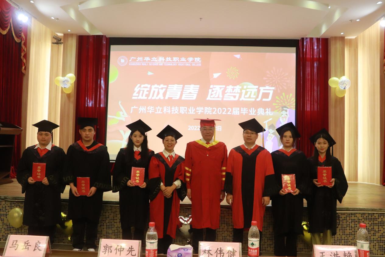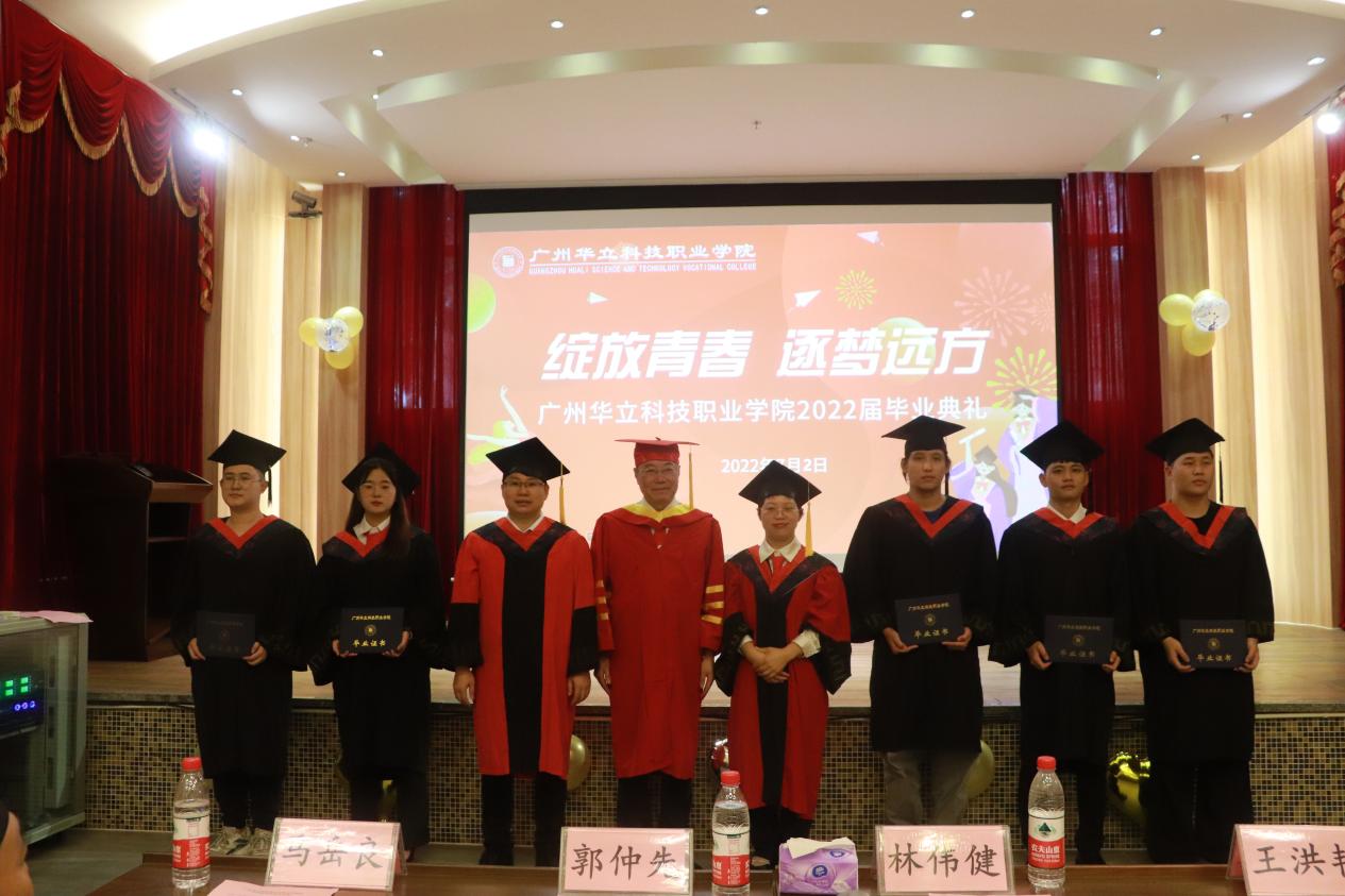 校长助理郭仲先宣读了《广州华立科技职业学院关于表彰2022届优秀毕业生的决定》。出席毕业典礼的学校领导一起为受表彰的毕业生代表颁发了荣誉证书,为参加毕业典礼的毕业生现场颁发了毕业证书。