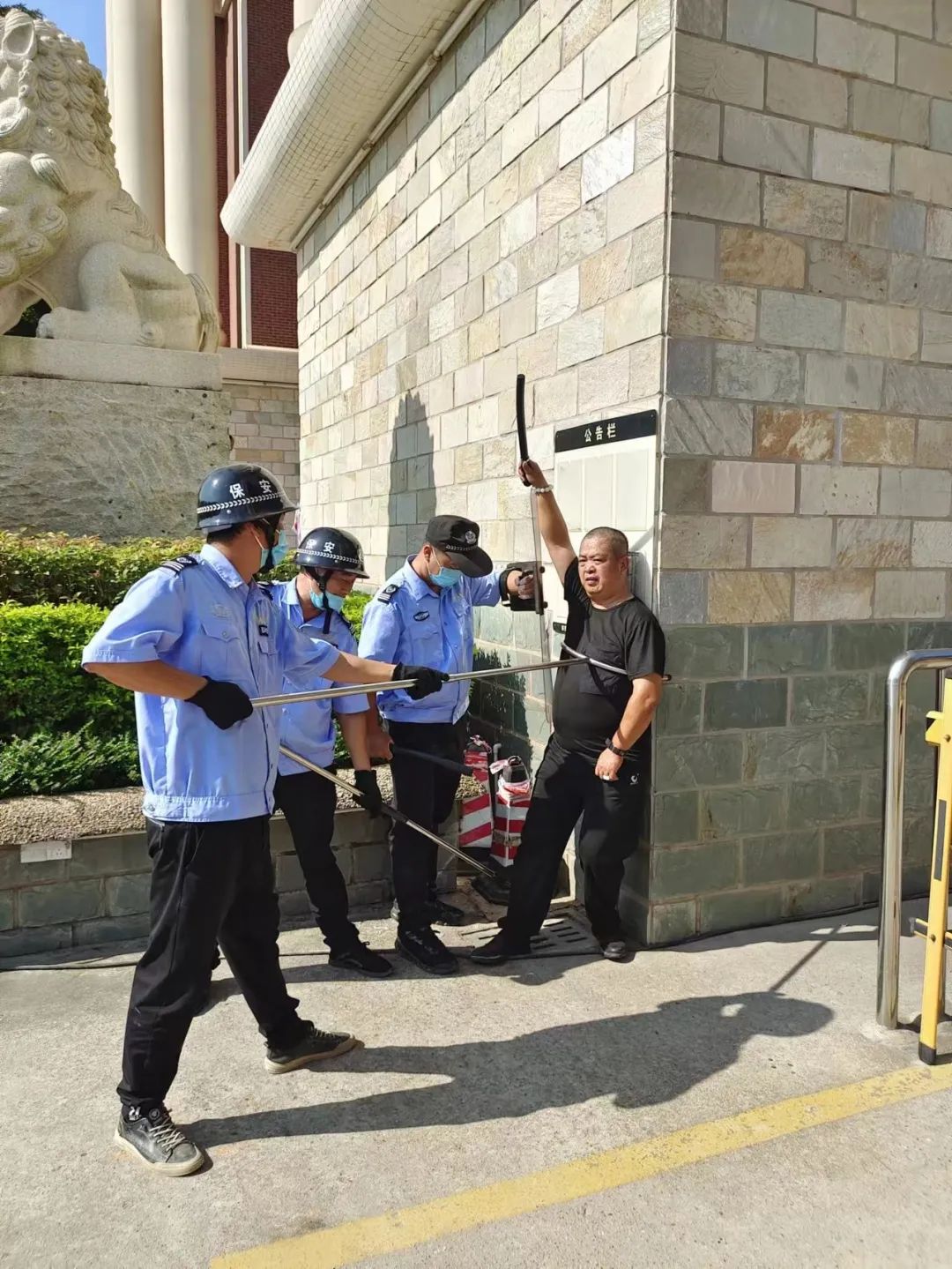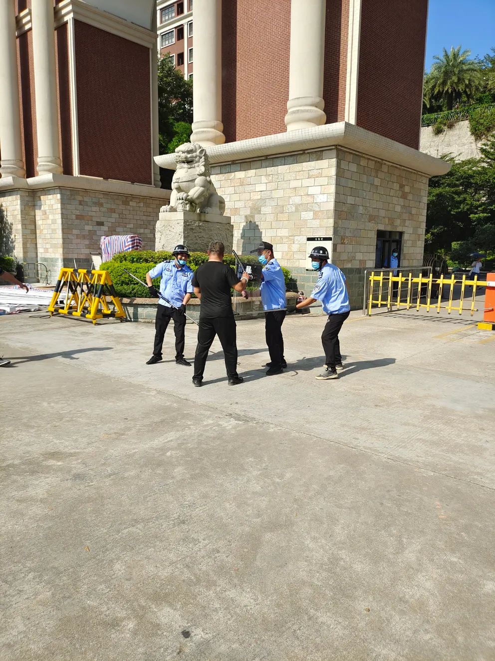 8月23日上午9时,一名扮演“歹徒”的工作人员试图闯入校园,对师生安全造成了威胁。校园安保人员发现“歹徒”硬闯校园,一名安保马上一键报警,并立刻打电话给校领导派人到现场协助安保人员将其制服,然后马上回到站位,与另外两名安保一同抵御。安保人员手持脚叉、钢叉、防暴盾等防暴工具,把“歹徒”压制到角落或者地上,夺取凶徒武器交由于警方、保护现场,并立刻回到岗位,做好上报指示。