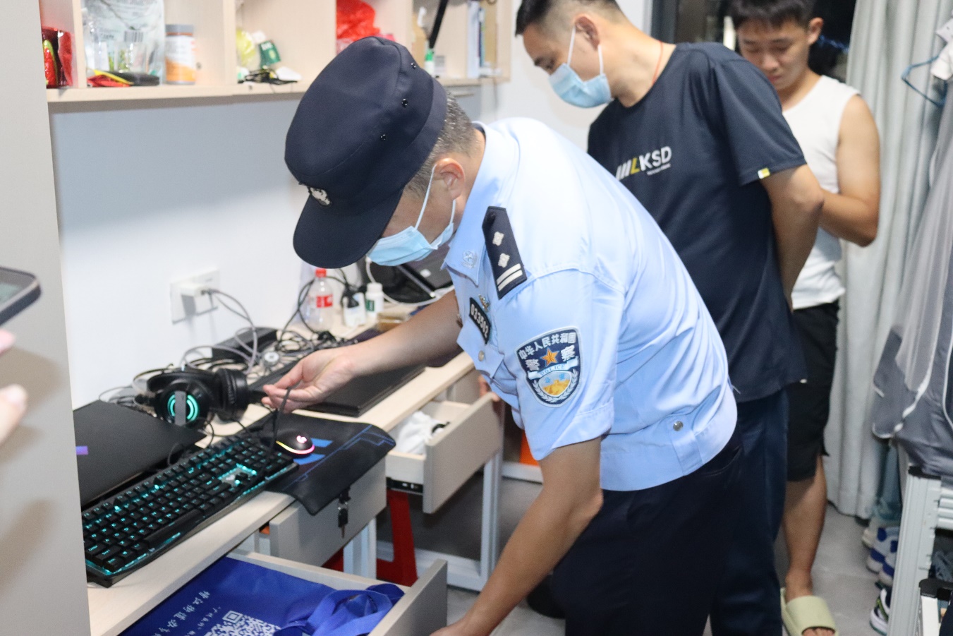 此次校警联动活动,围绕“校园安全隐患排查”进行,我院保卫处处长陈胜军与派出所民警相互沟通校园安全稳定工作情况,带领派出所民警仔细检查了学校的物防、技防、人防等配备情况,重点对学生宿舍存在的安全隐患排查,包括宿舍楼楼道设施安全、宿舍内用电安全、违禁物品等进行排查,检查过程中提醒学生加强对财物的保管,提高防诈意识,同时就检查发现存在问题面对面与同学普及预防安全隐患知识。