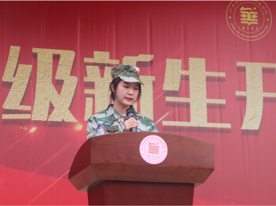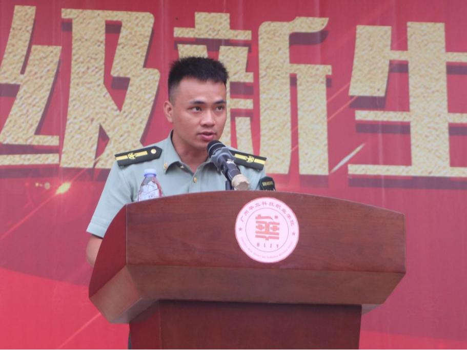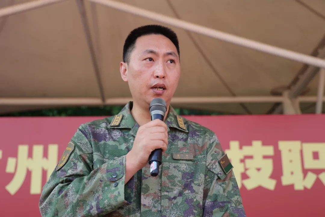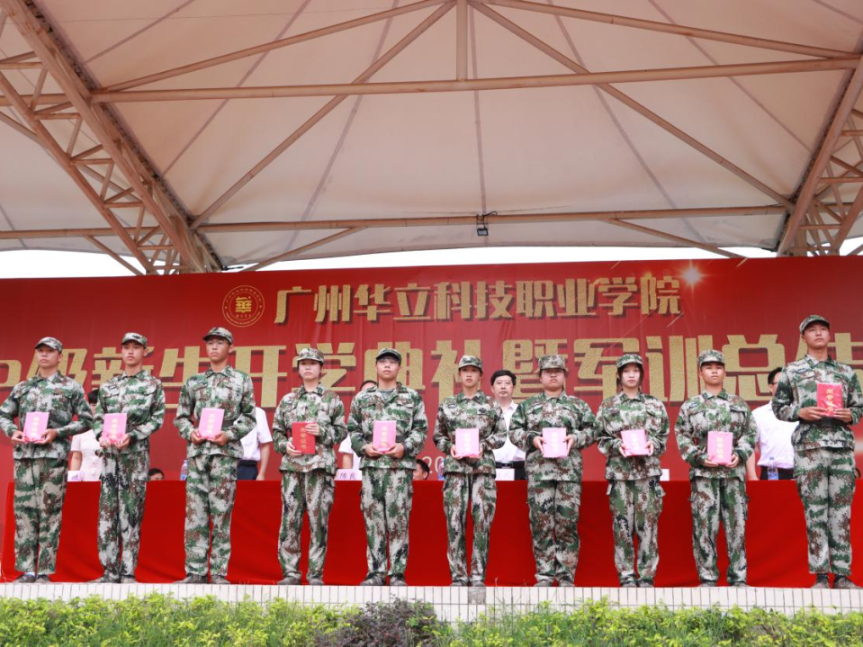 广州市增城区人民武装部军训团团长唐华和谢伟超代表发言。他们在发言中一致表扬了同学们在军训时的优异表现。认为同学们提高了思想政治觉悟,激发出了高涨的爱国热情和革命英雄主义精神,树立了国防意识和国家安全意识,增强了集体观念和组织纪律观念,培养了艰苦奋斗、吃苦耐劳的优良作风。