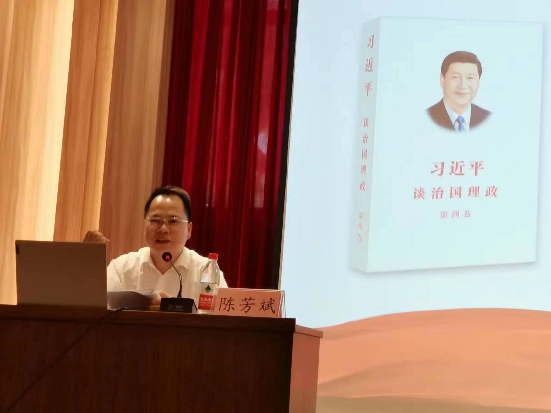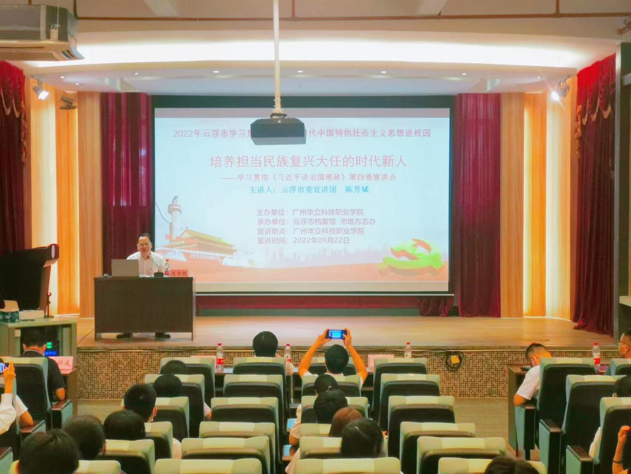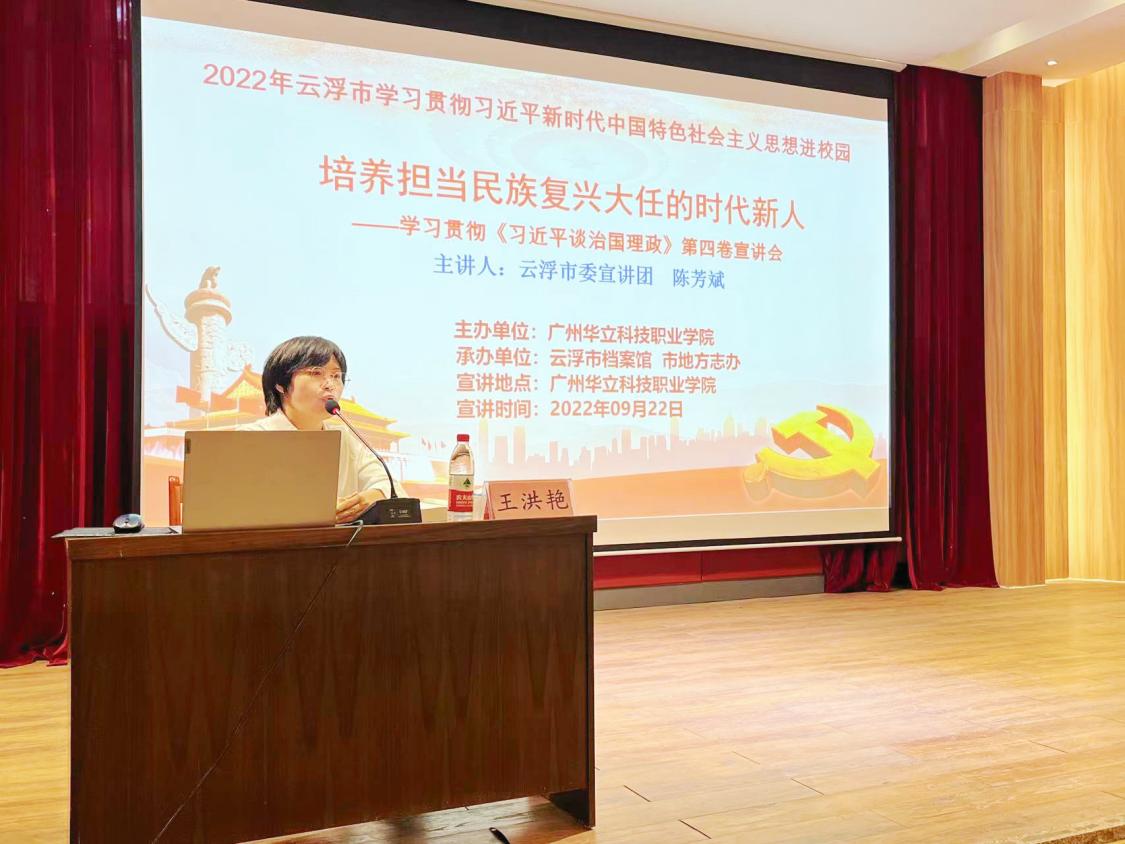 教育兴则国家兴,教育强则国家强。培养什么样的人、如何培养人以及为谁培养人,一直是习近平总书记强调的重中之重。为了推动广大师生进一步增强学思想、悟思想、用思想的自觉性与坚定性;不断提高政治判断力、政治领悟力、政治执行力。9月22日,广州华立科技职业学院云浮校区特邀云浮市档案馆馆长、云浮市人民政府地方志办公室主任、云浮市委宣讲团成员陈芳斌来校开展学习贯彻《习近平谈治国理政》第四卷专题报告会。