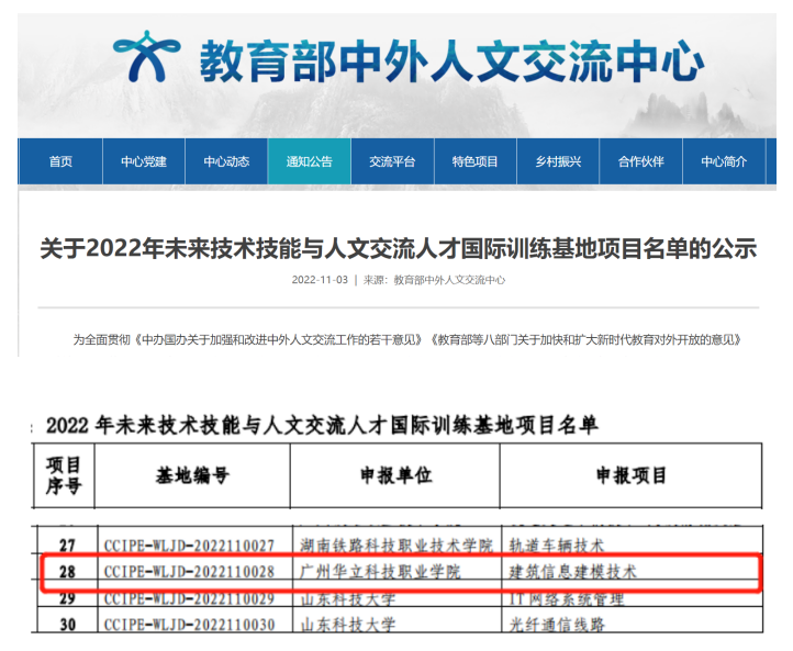 2022年11月3日,教育部中外人文交流中心发布《关于2022年未来技术技能与人文交流人才国际训练基地项目名单的公示》,广州华立科技职业学院城建学院申报的《建筑信息建模技术》基地项目成功入选教育部中外人文交流中心“未来技术技能与人文交流人才国际训练基地”项目!