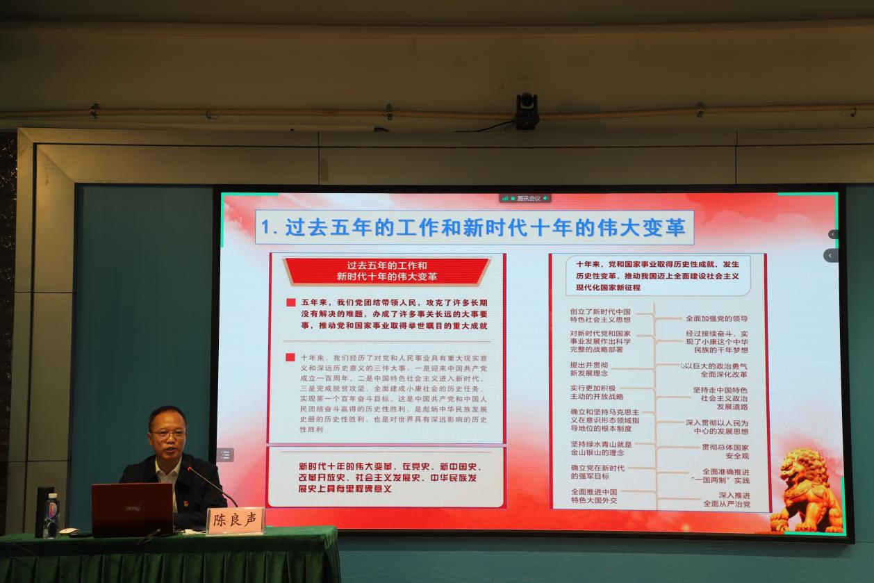 中国共产党第二十次全国代表大会于今年10月16日至22日在北京举行。为在我校迅速掀起学习宣传贯彻党的二十大精神的热潮,11月2日下午,我校党委理论学习中心组(扩大)在图书馆104举行学习会,由学校党委书记陈良声进行领学。