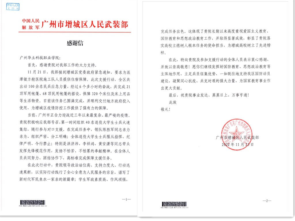 11月23日,我校收到增城区武装部的感谢信,感谢我校武装部带领广大退役大学生士兵参加抗疫工作。