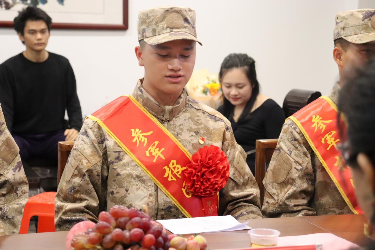 新兵入伍欢送会在行政楼3楼会议室召开,4名新兵身着戎装,头戴军帽,胸佩大红花和彩带,神采飞扬、意气风发。会议共六项议程,首先由新兵代表林浩作了振奋人心的发言,他表示有这个特别的机会去学习锻炼和报效祖国感到无比光荣,将会在部队努力学习,不怕吃苦,坚决服从命令,听从指挥,刻苦训练,勤学本领,做到政治合格、军事过硬、作风优良、纪律严明、保障有力、精忠报国,为国家的和平与安宁扛好枪、站好岗,表达了自己保家卫国的坚定决心。第二第三项议程是分别是新兵家长和辅导员发表讲话,希望即将入伍的4名新兵牢记初心,用汗水磨练意志,用热血铸就军魂,扎根军营建功立业,成就精彩人生,为家乡增光添彩。