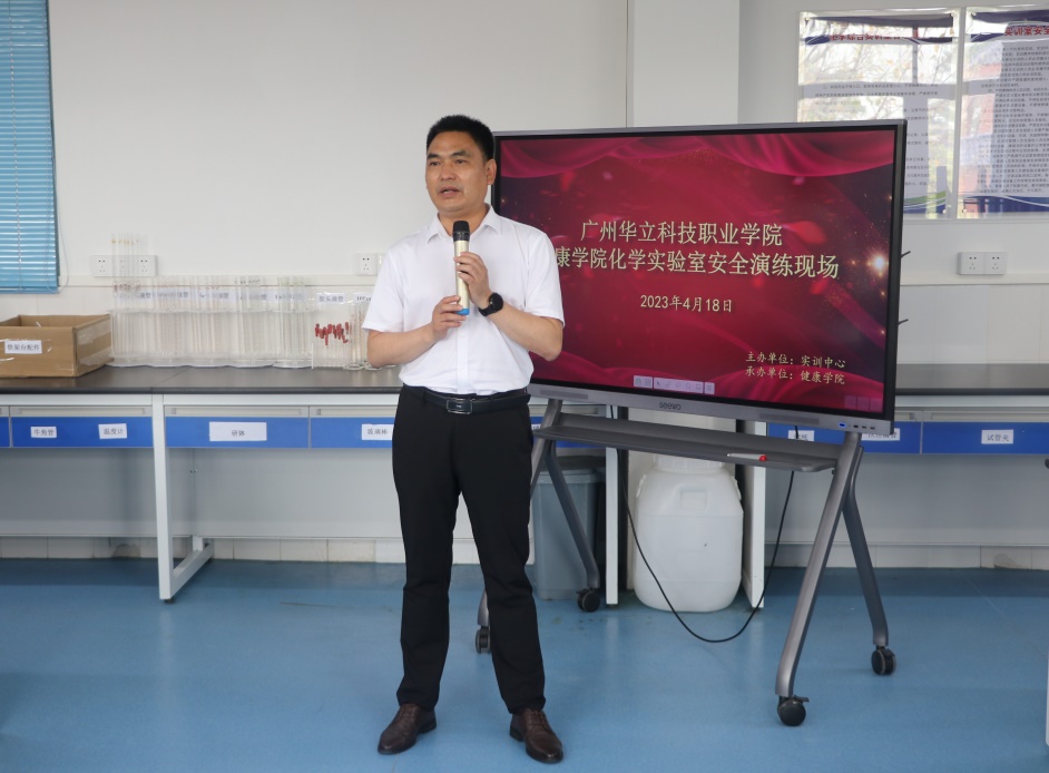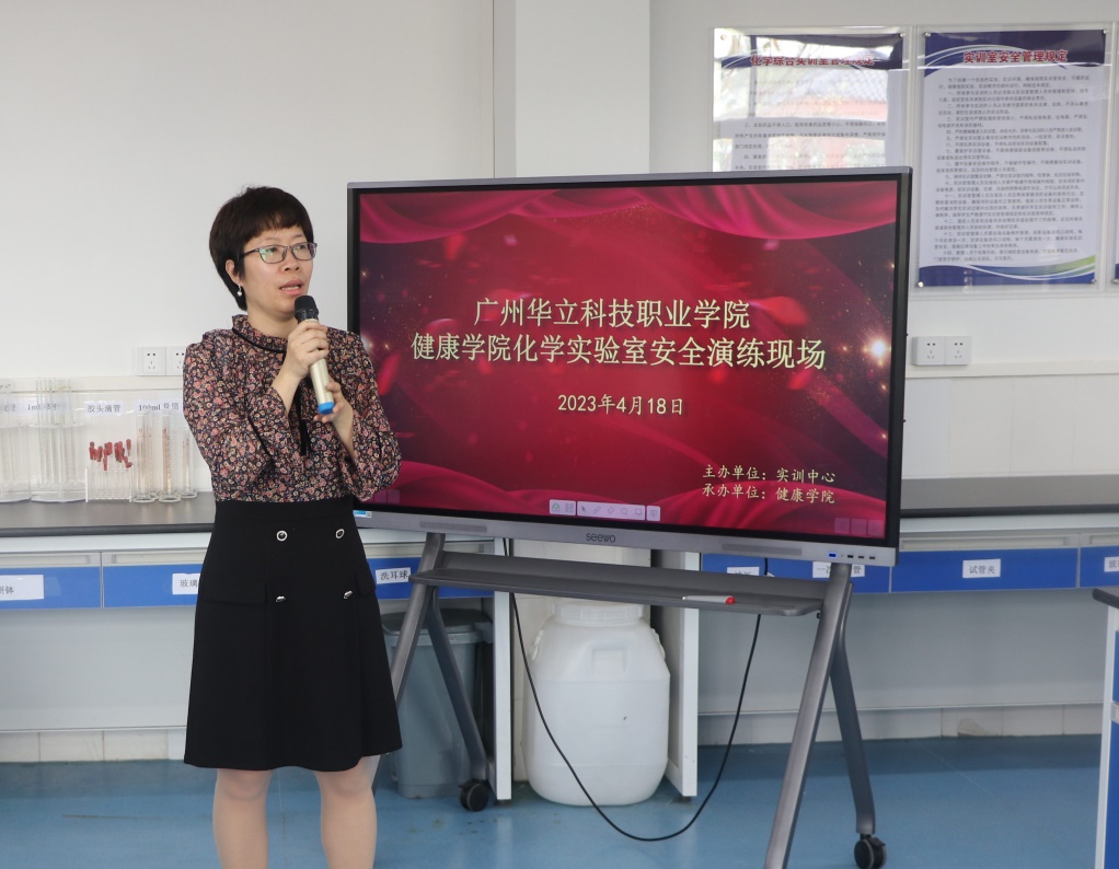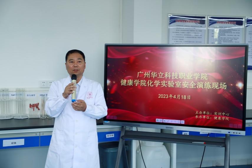 为认真贯彻落实《广东省教育厅转发教育部办公厅关于印发《高等学校实验室安全规范》的通知》的文件精神,切实提高师生实验室安全意识,确保化学实验室的安全性,提高学校实验室突发事件的应急处置能力。4月18日上午,由实训中心主办,健康学院承办的化学实验室安全演练在西2-207室举行。学校董事长助理李引章,党委副书记、副校长高尧来,校长助理叶春桃,各二级学院(二级部门)负责人、实验室负责人、实训中心、保卫处、总务处、学生处、教务处及其他专业的教师代表和学生代表参加了本次演练,本次演练由健康学院许小玲老师和2021级药学吴丹婷同学主持。