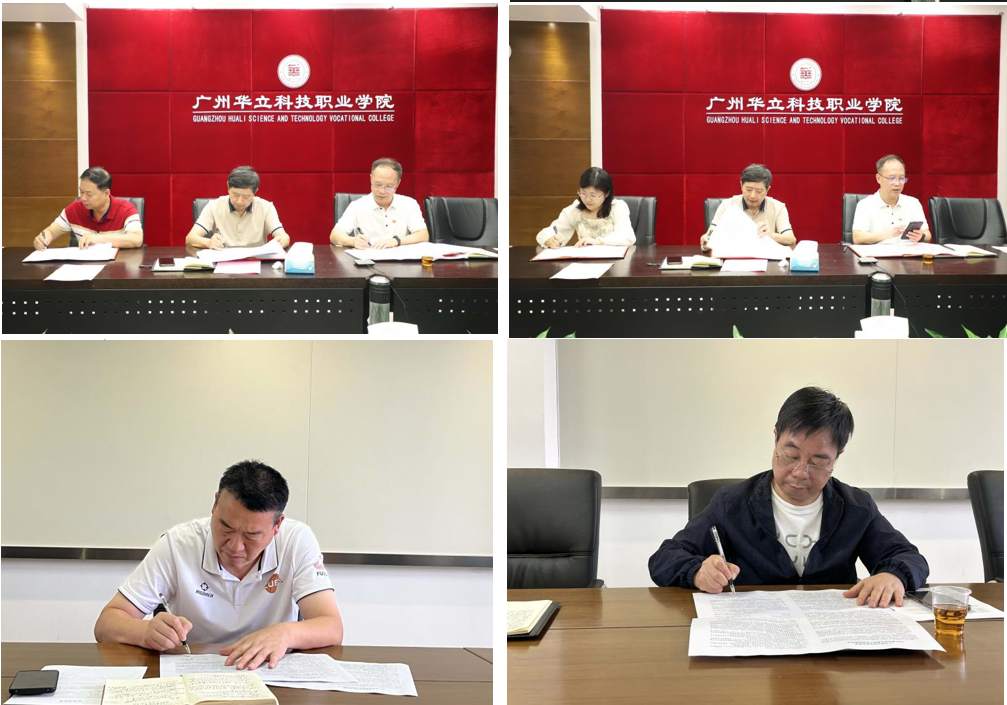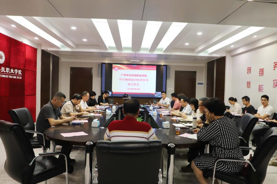学校领导作全面就业动员和工作指示后责任状签订仪式正式进行,由学校校长、党委书记分别亲自与学校就业指导中心、各二级学院领导共同签署“广州华立科技职业学院2023届毕业生就业责任书”。