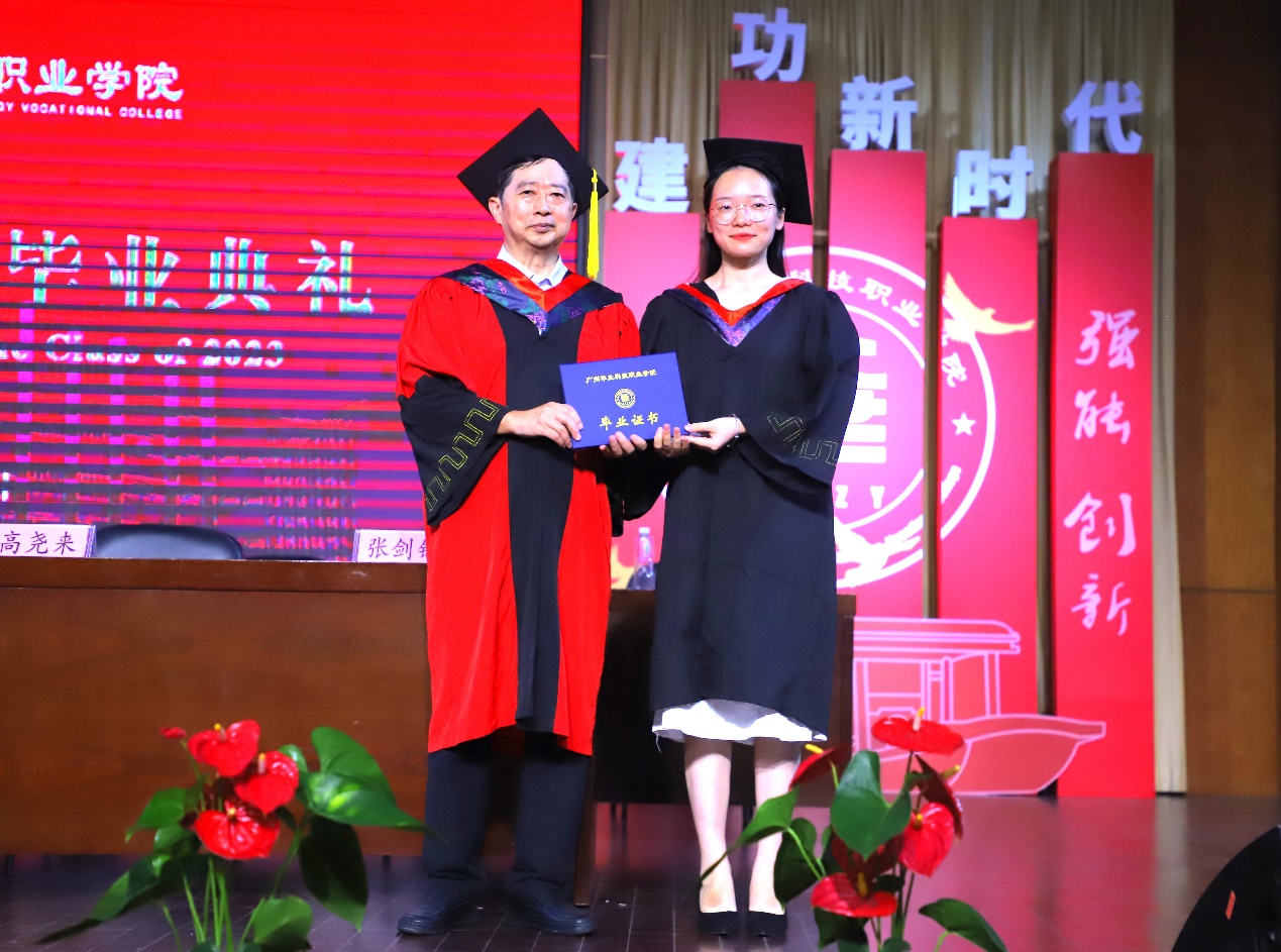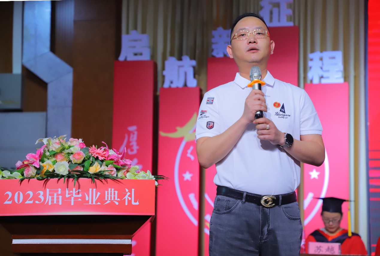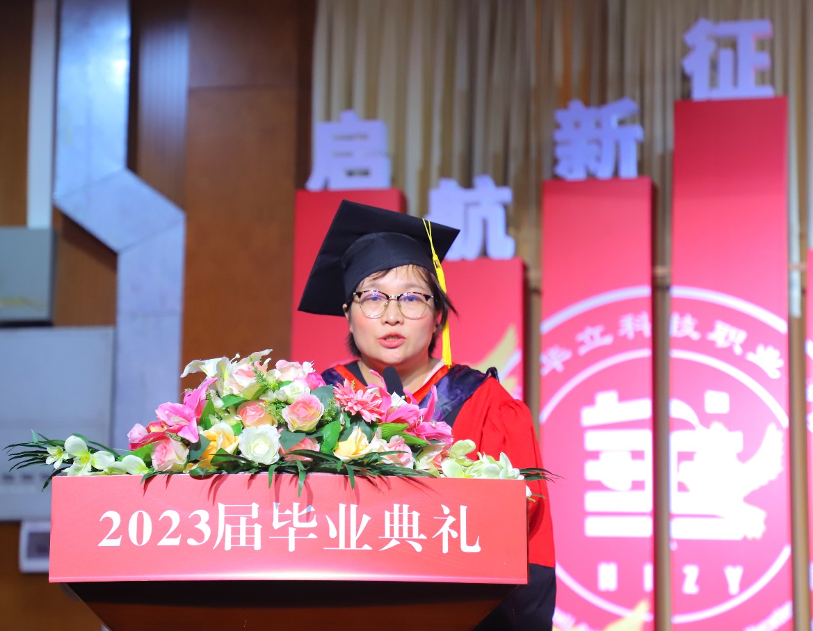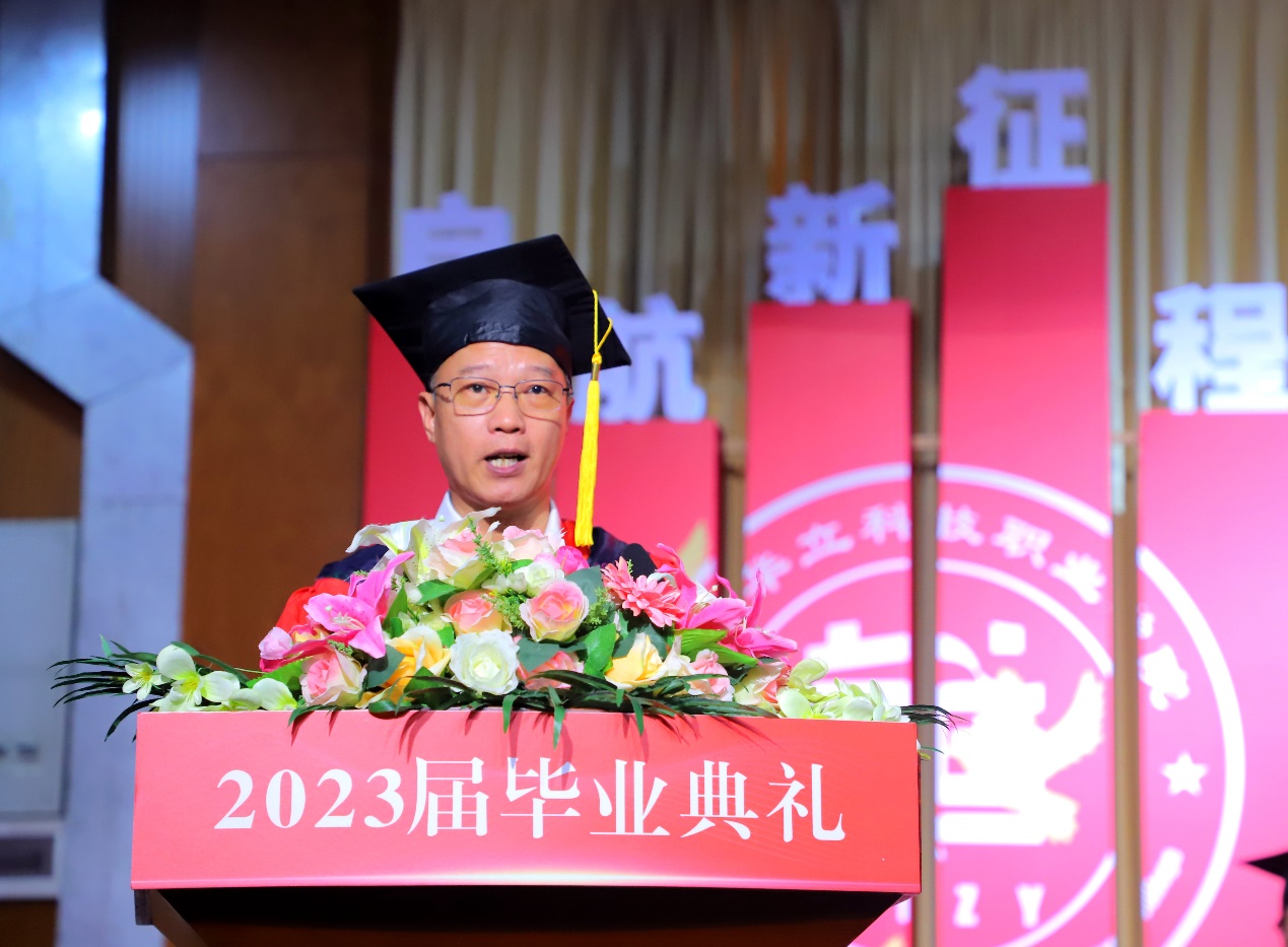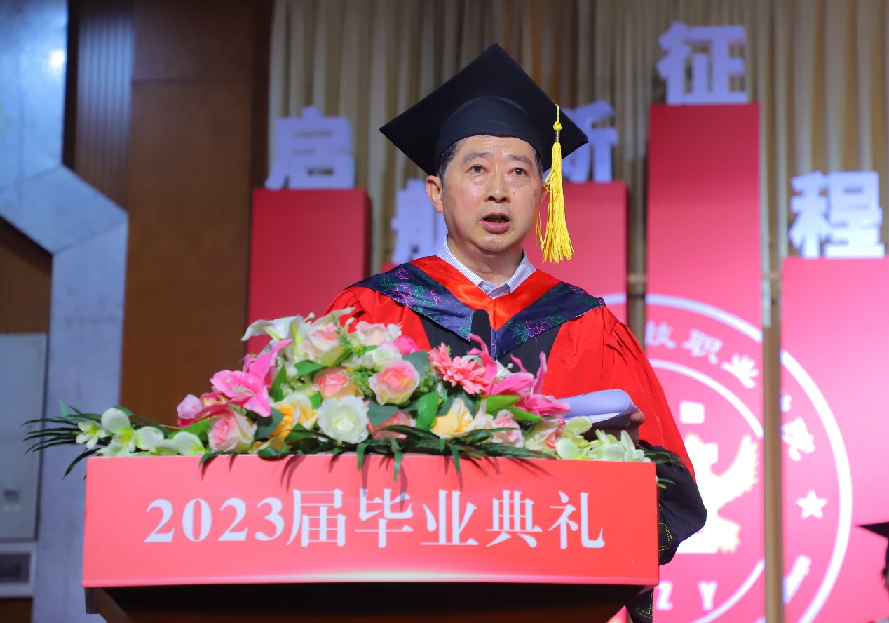 易健民校长对2023届毕业生表示了最热烈的祝贺和最深情的祝福。在即将离开校园,开启崭新的人生之旅之际,易校长寄语毕业生们要牢记“志存高远,实现自我价值”,要坚持“终身学习,造就无悔人生”,要“勇于实践,报效国家社会” 。易校长希望同学们踏进社会后要虚心向能工巧匠学习,掌握技术要领,传承“秘籍”“窍门”;又要敢于突破条条框框,大胆革新创造,把每一道工序、每一个项目、每一项工程做细、做实、做精、做出彩,在平凡的工作岗位上创造不平凡的业绩,以优异的技能报效祖国、回馈社会。期待毕业生们勇敢的放飞青春的梦想,在新征途上展翅高飞。