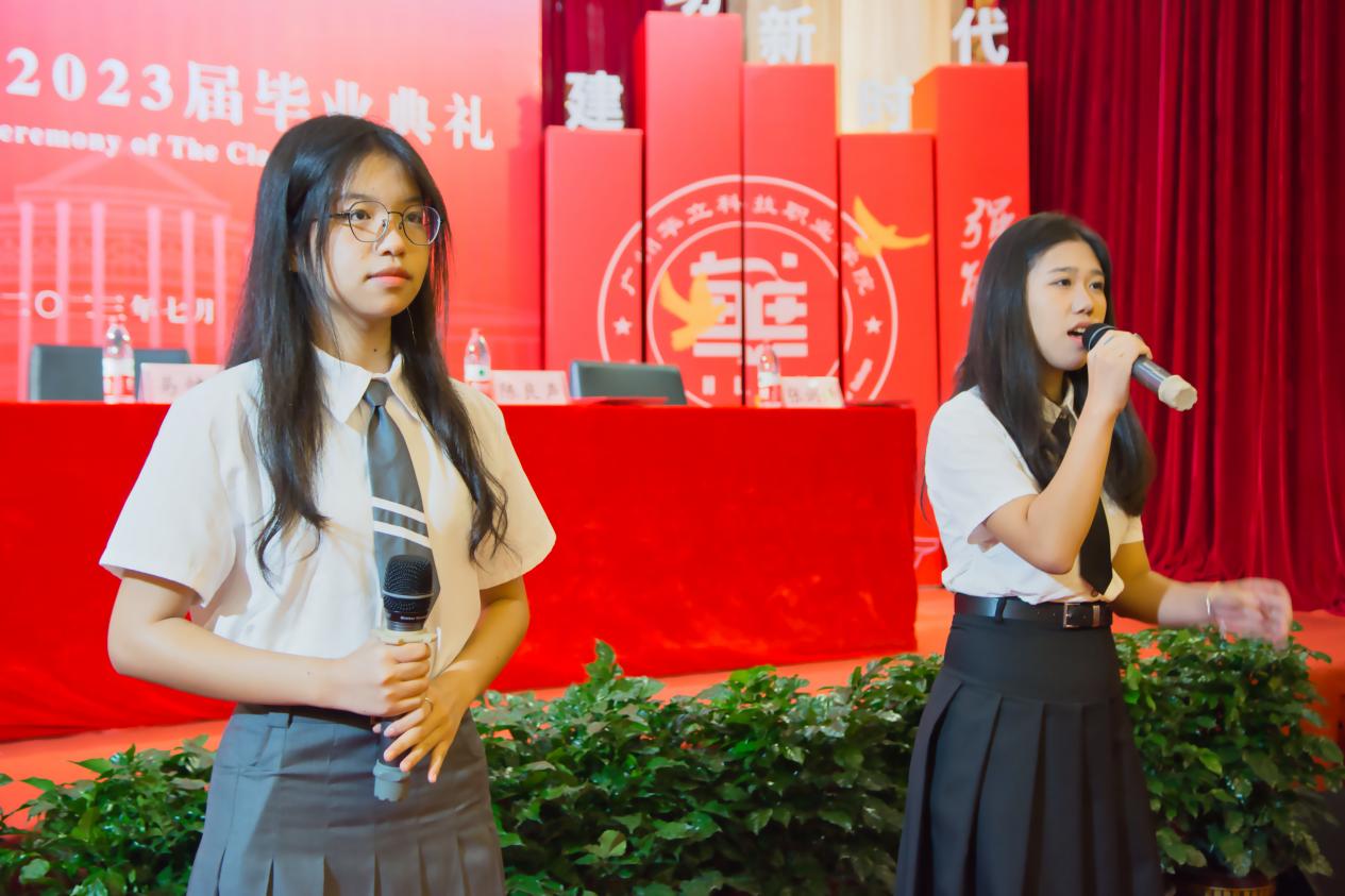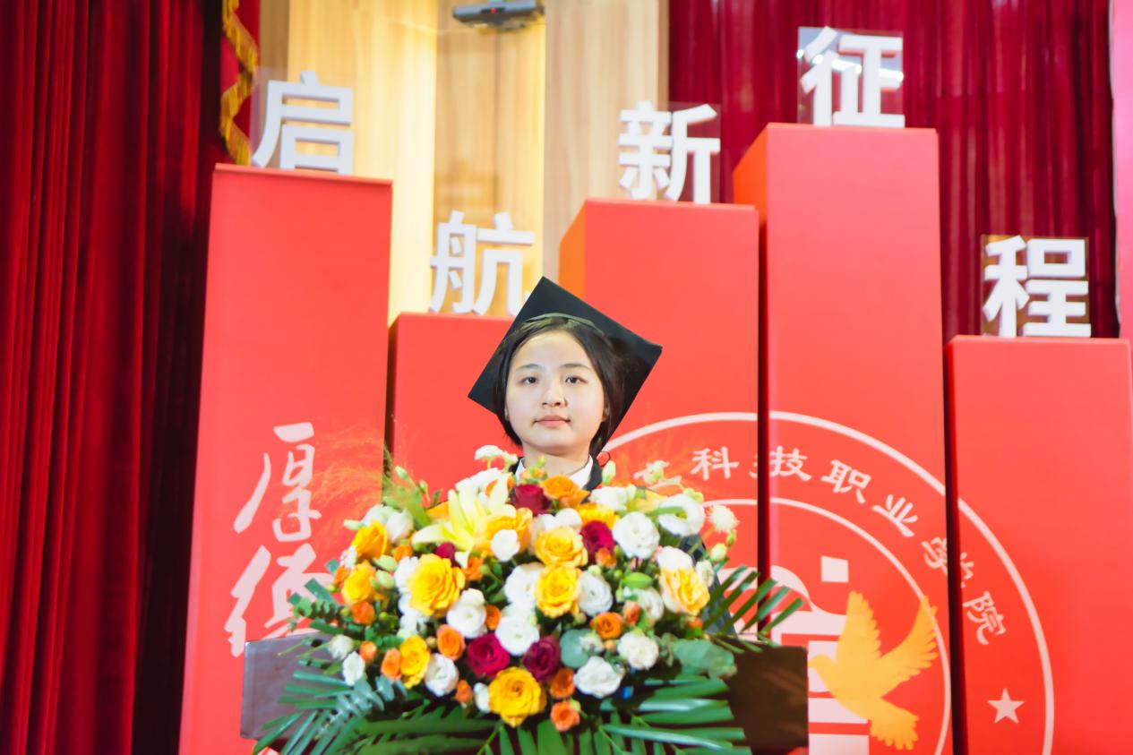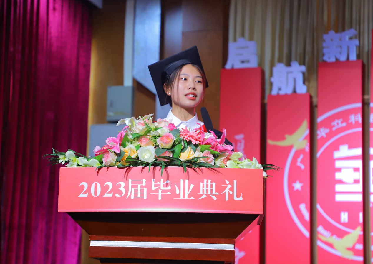 教育学院的谢梓婷同学代表2023届全体毕业生进行发言。她说到,感谢学校的悉心栽培,母校生活不只丰富了我们的知识,提升了我们的技能,更磨炼了我们的意志。感恩母校给予我们一个又一个登高望远的阶梯,让我们有能力有底气站到更高的舞台,不断成长。表示自己会一直铭记“厚德 强能 务实 创新”的校训,并身体力行。经济管理学院毕业生代婷婷发言时回顾自己大学三年的学习生活。她表示,要用行动和奋斗书写属于新时代华立人的多彩篇章。