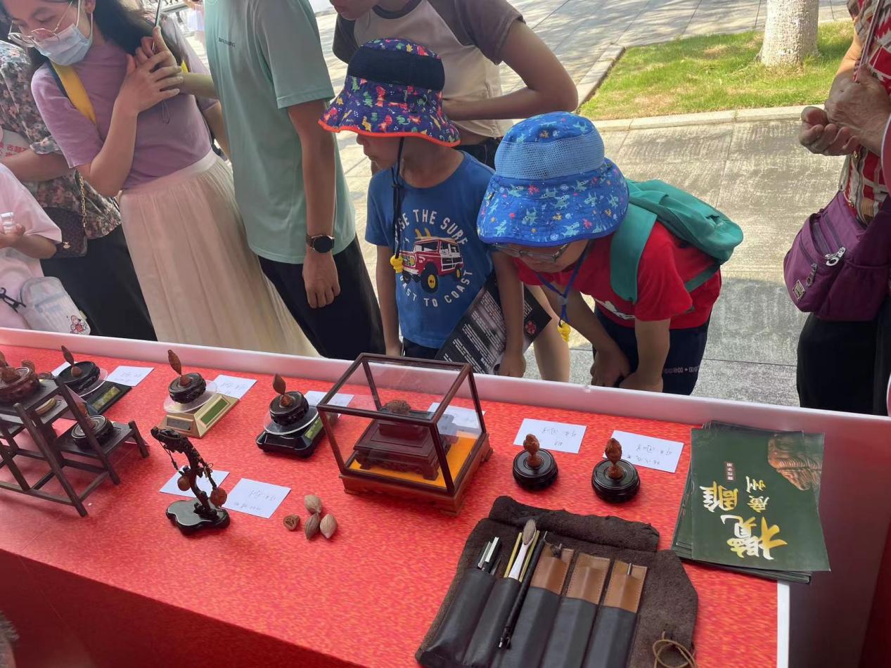 周汉军榄雕作品题材广泛,擅长人物及乡土题材的创作,反映民间、当地风情及生活面貌;善于技法和题材创新,将红色题材、抗疫题材融入创作。在展示现场,榄雕协会师生还创新了榄雕艺术文创贴纸,通过集赞、游戏等方式宣传和推广广州榄雕技艺和榄雕文化,现场吸引了广大市民的围观点赞和大小朋友的喜爱。