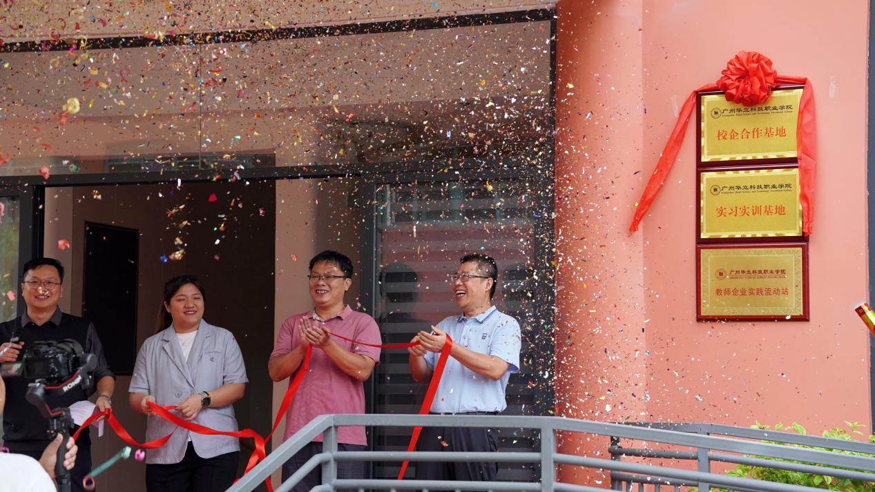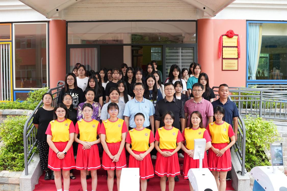 在师生们的见证下,学校陈显强副校长、产教融合办韦建林副主任、教育学院朱君副院长及华立狮宝宝黎璎慧教学主任共同为广州华立狮宝宝幼稚园“校企合作基地”、“实习实训基地”与“教师企业实践流动站”揭牌。