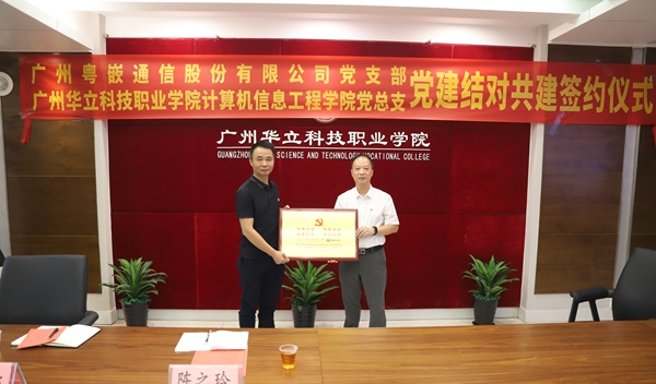双方代表就党建结对共建工作进行深入交流。学校党委书记陈良声与广州粤嵌通信科技股份有限公司党支部代表李春飞总经理为党建结对共建授牌,标志着校企党建结对共建的正式启动。