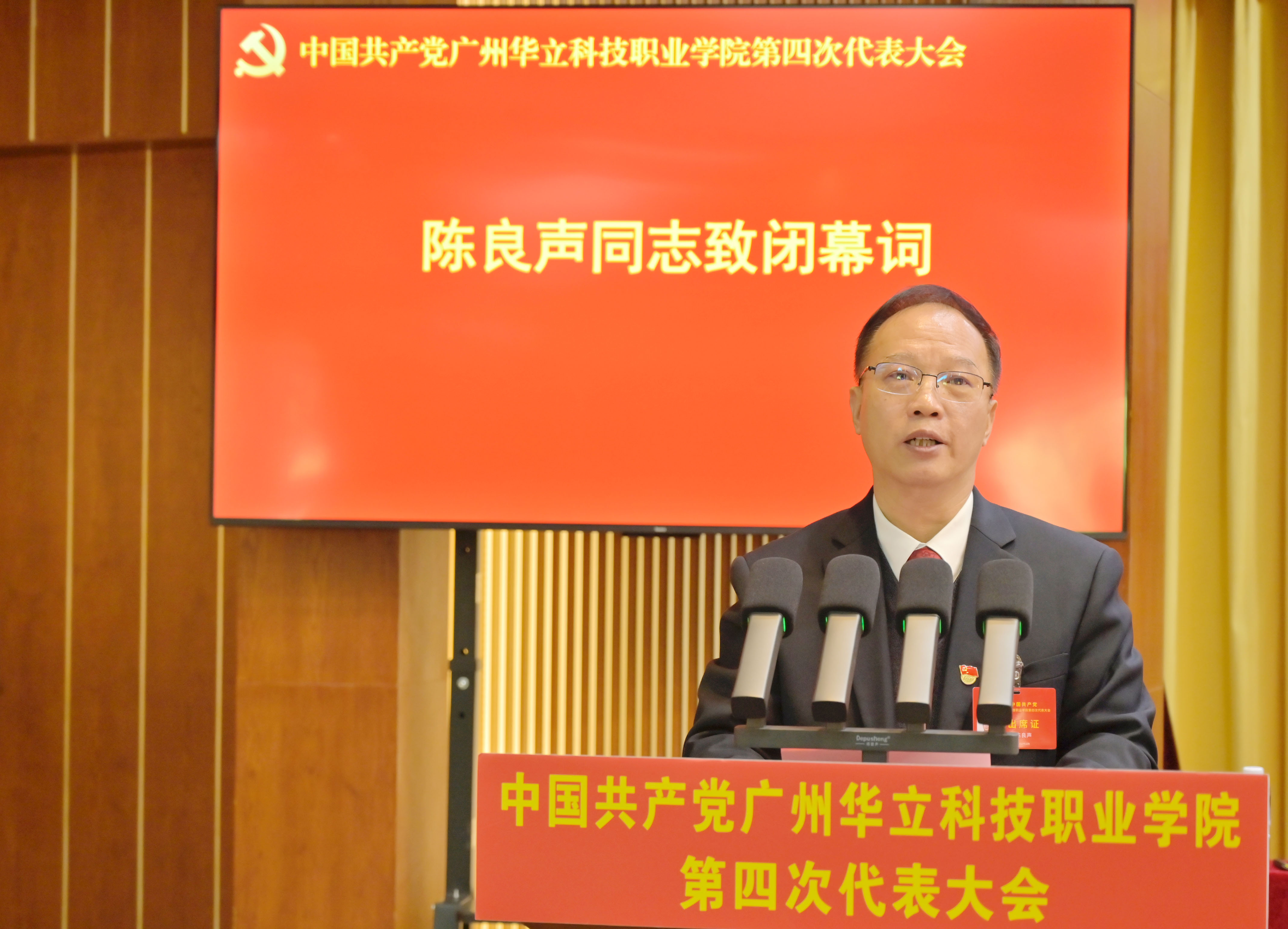 新蓝图鼓舞人心,新使命催人奋进,新征程勇往直前。12月20日上午,中国共产党广州华立科技职业学院第四次代表大会在选举产生了新一届党委委员和纪律检查委员会委员、通过了中国共产党广州华立科技职业学院第三届委员会工作报告和第一届纪律检查委员会工作报告的决议后,于东区图书馆一号报告厅胜利闭幕。学校校长陈德清主持闭幕大会,学校党委书记陈良声致闭幕词。