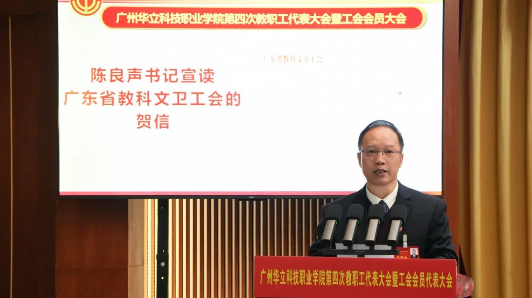 陈良声宣读了来自广东省教科文卫工会的贺信。广东省教科文卫工会对广州华立科技职业学院工会的工作表示肯定,并希望学校工会要紧紧围绕学校中心工作,认真履行工会职能,在落实人文关怀、为教职工做好事办实事、丰富教职工生活等方面做了大量工作,较好发挥了工会的桥梁和纽带作用,为增强学校凝聚力做出了积极贡献。