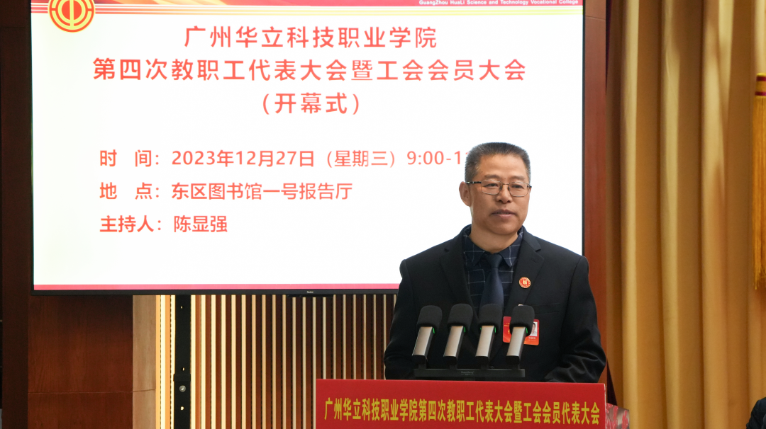 12月27日,广州华立科技职业学院第四次教职工代表大会暨工会会员代表大会(以下简称“双代会”)在广州校区东区图书馆第一报告厅隆重召开,学校正式代表190人参加会 议。广东省教科文卫工会向大会发来了贺信。大会上,校长陈德清作学校工作报告,党委书记陈良声宣读了广东省教科文卫工会的贺信,常务副校长、工会主席马俊代表广州华立科技职业学院第三届工会委员会作工会工作报告。大会预备会议由副校长高尧来主持,开幕式由副校长陈显强主持,闭幕式由校长助理叶春桃主持。