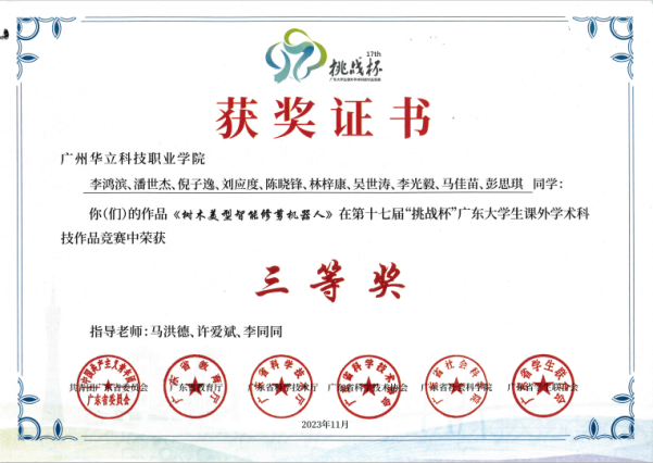 近期,在第十七届“挑战杯”广东大学生课外学术科技作品竞赛中,我校电力学院学生李鸿滨、潘世杰、倪子逸、刘应度、陈晓锋、林梓康、吴世涛、李光毅、马佳苗、彭思琪的参赛作品《树木美型智能修剪机器人》(指导教师马洪德、许爱斌、李同同)荣获省级三等奖。