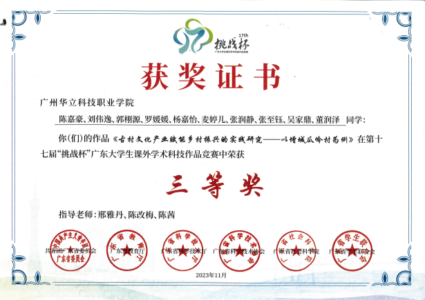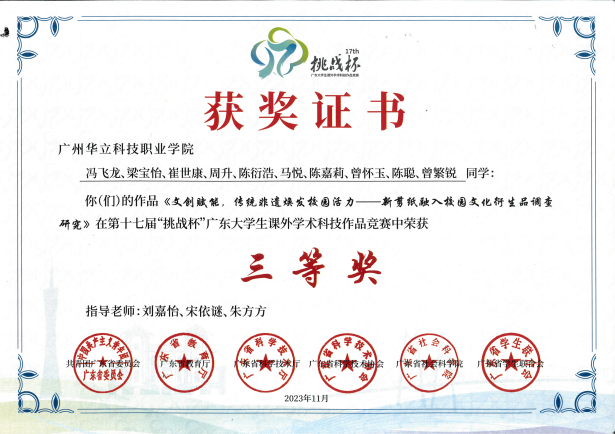 近期,在第十七届“挑战杯”广东大学生课外学术科技作品竞赛中,我院学生项目荣获省级三等奖两项。