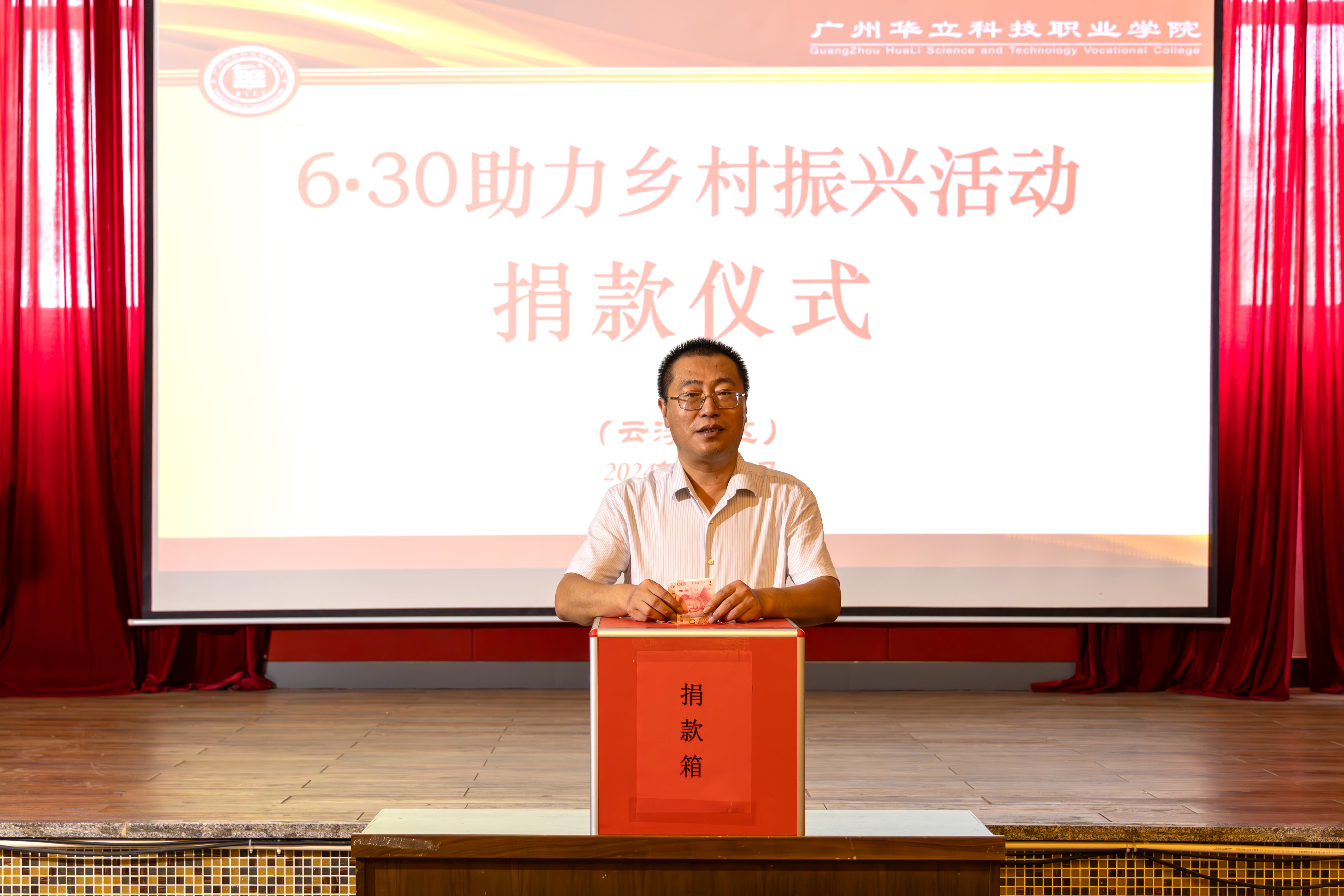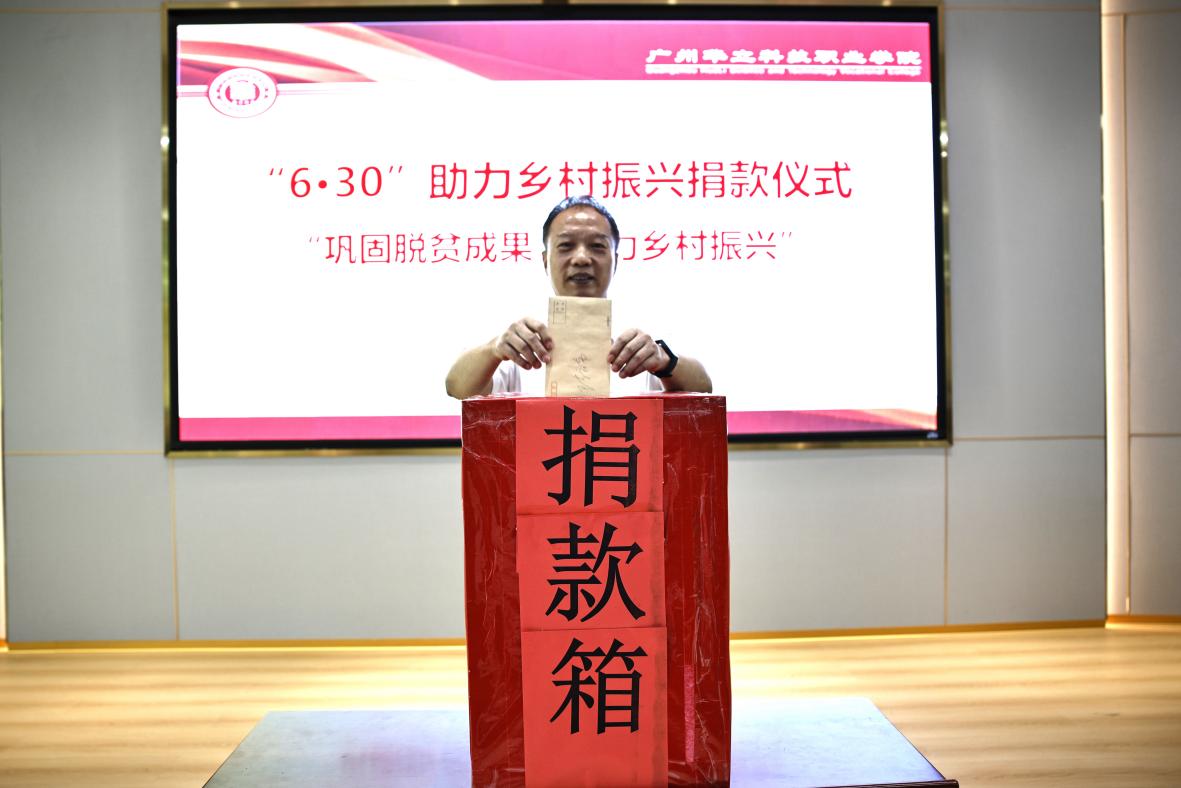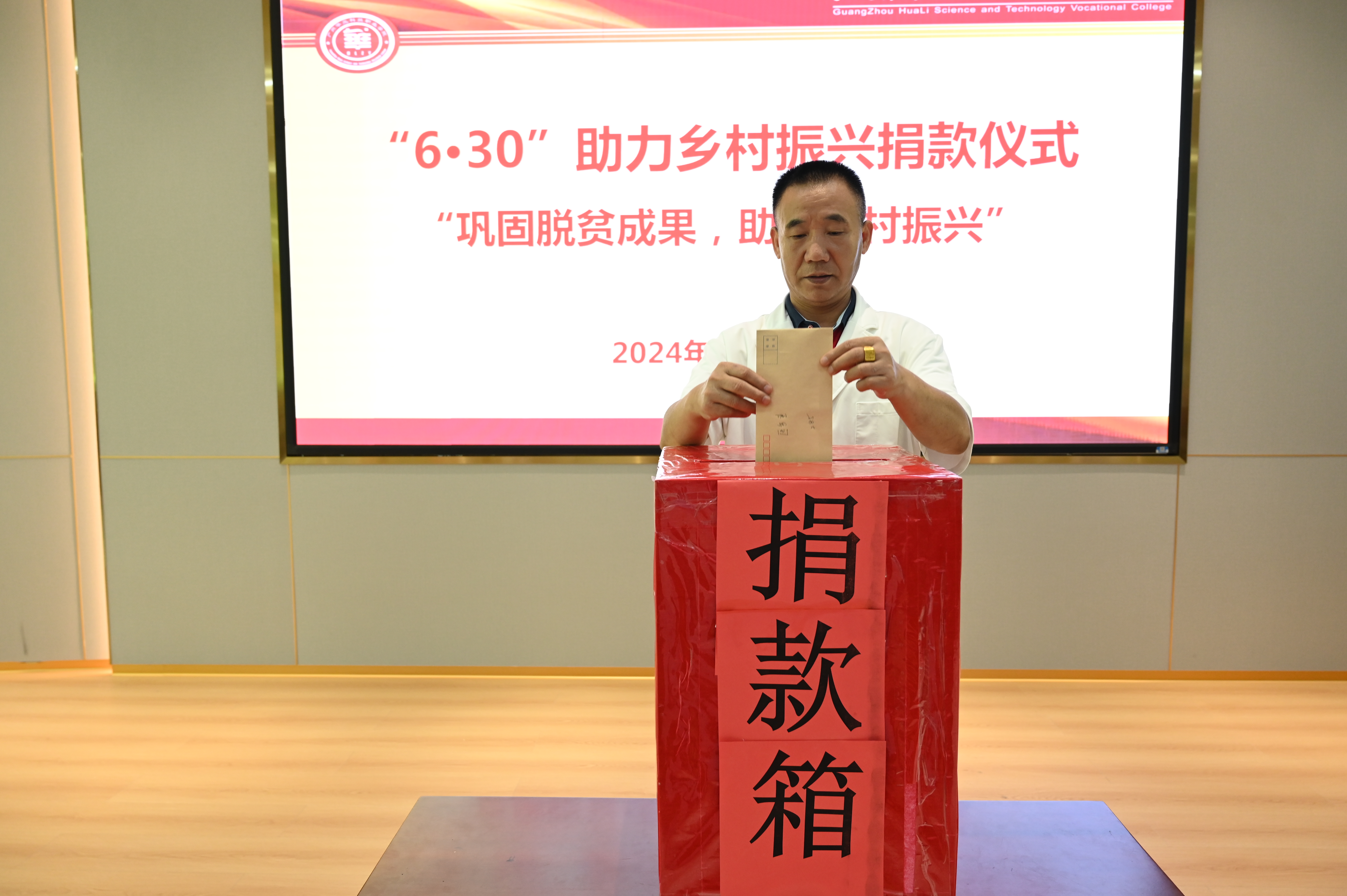 为进一步弘扬中华民族扶贫济困、乐善好施的传统美德,根据《广东省2024年“6·30”助力乡村振兴活动工作方案》文件精神,6月28日上午,学校工会举行了“6·30”助力乡村振兴爱心捐款活动。学校领导班子成员、教师代表、学生代表参加了捐款仪式。捐款仪式由工会主席、常务副校长马俊主持。