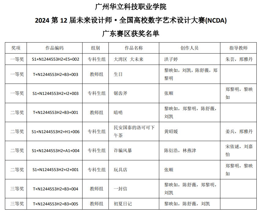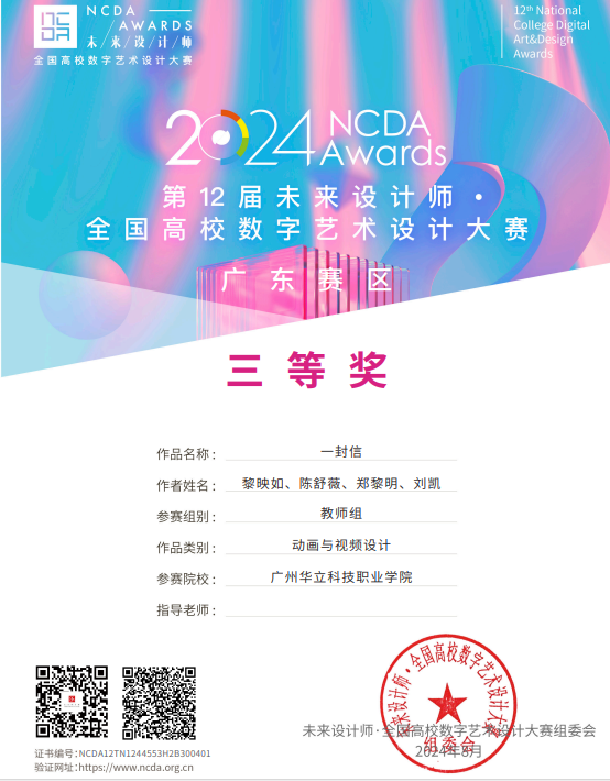 本次大赛自启动以来,吸引了全国1891所高校的积极参与,共收到作品298763件,设立了29个省级赛区。经过激烈的校级赛、资格赛、省级初赛、省级决赛及全国总决赛的多轮选拔,我校艺术与传媒学院师生取得了令人瞩目的成绩:在全国总决赛中,获得学生组二等奖1项。在广东省赛区获奖13项,其中学生组一等奖2项,二等奖3项,教师组一等奖1项,二等奖1项,三等奖2项,优秀指导教师4项。