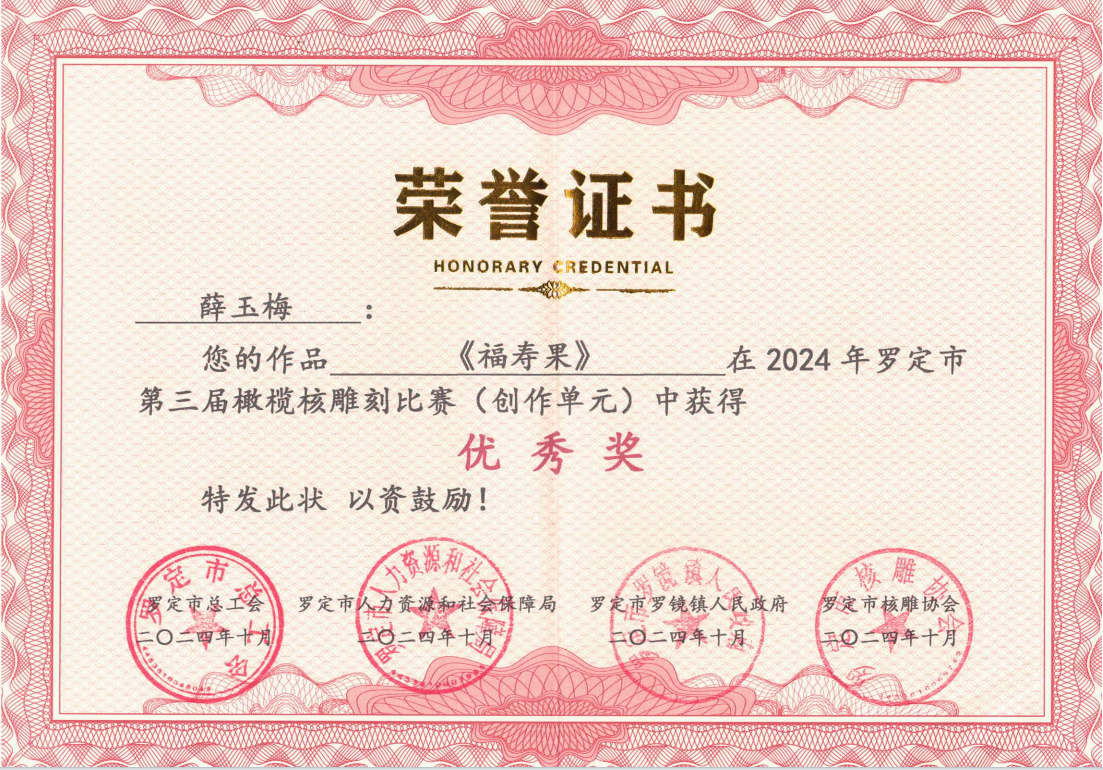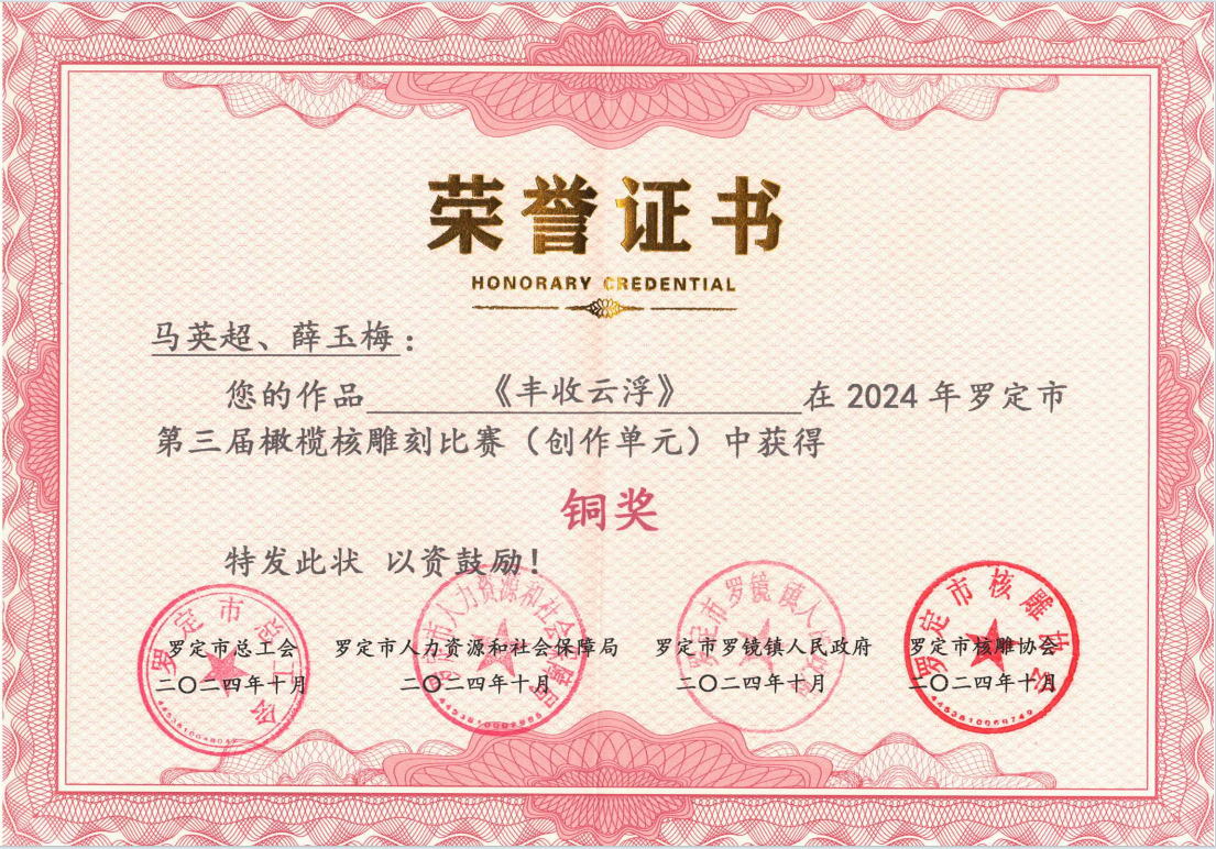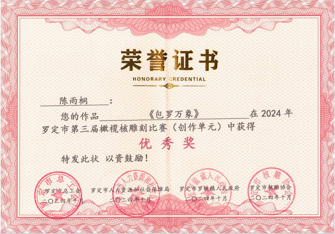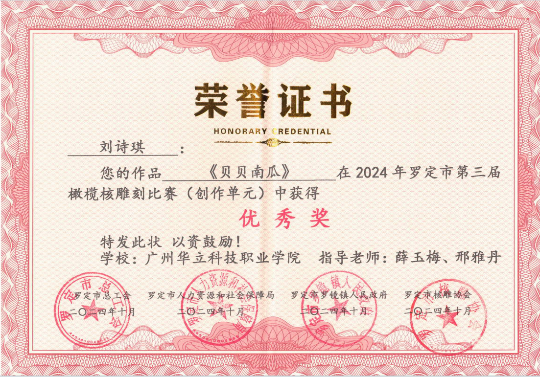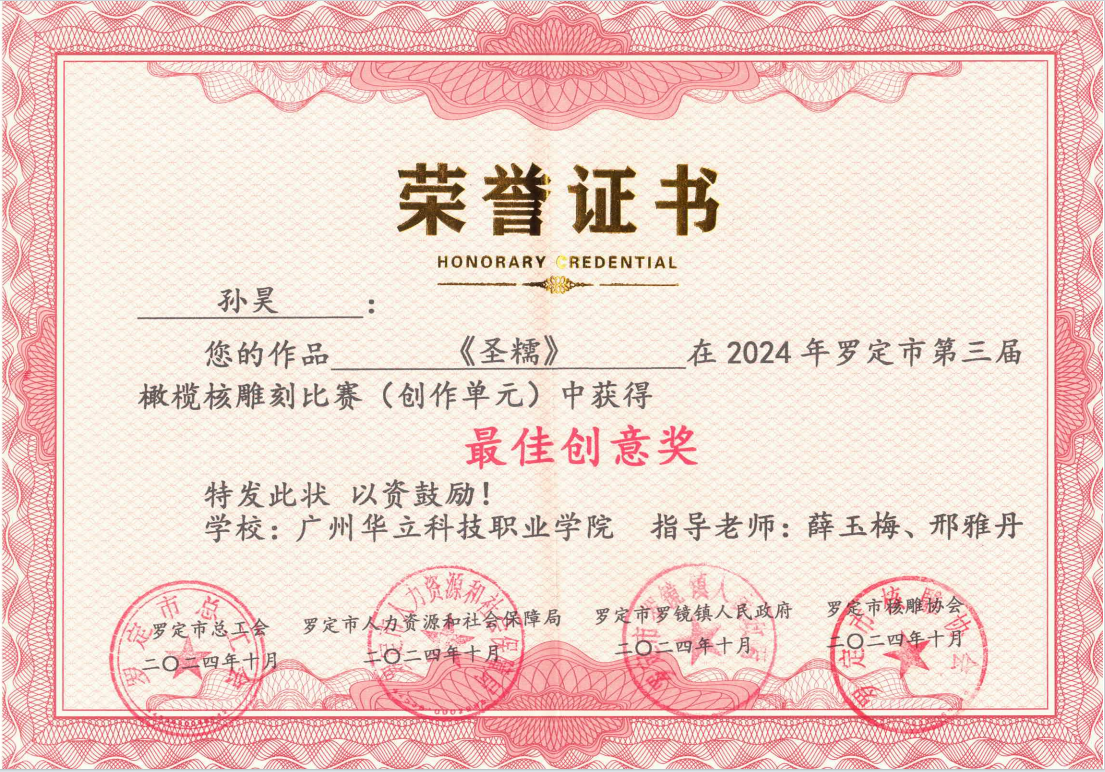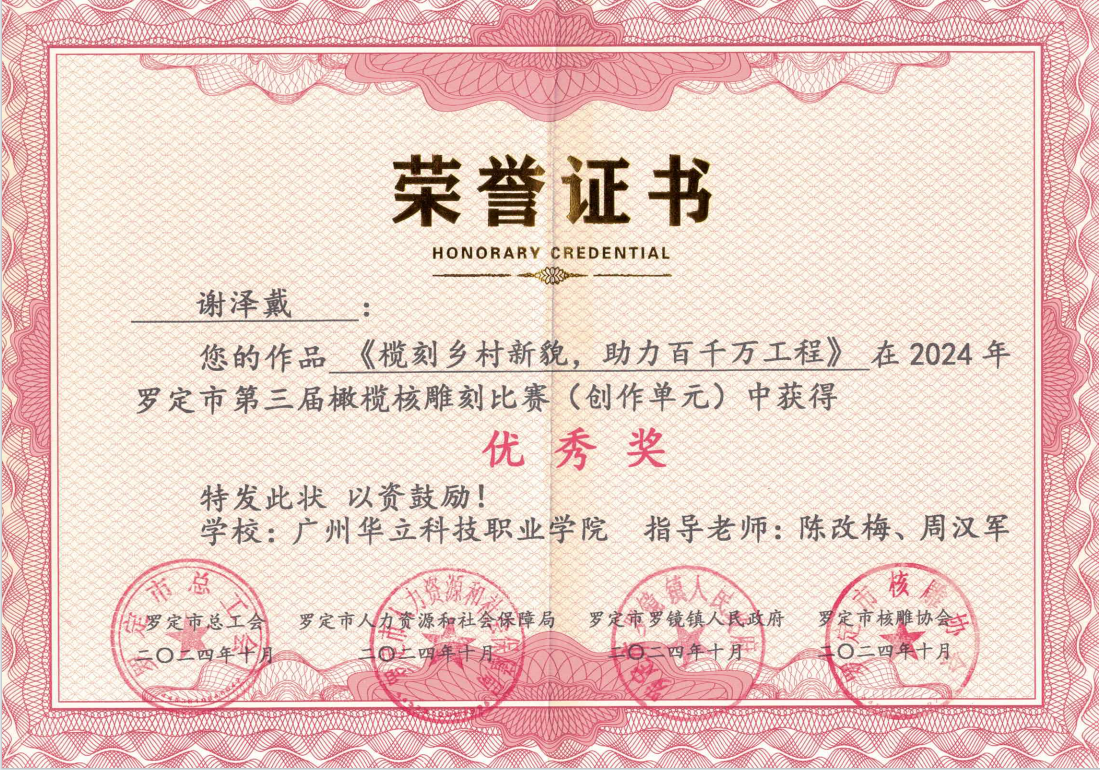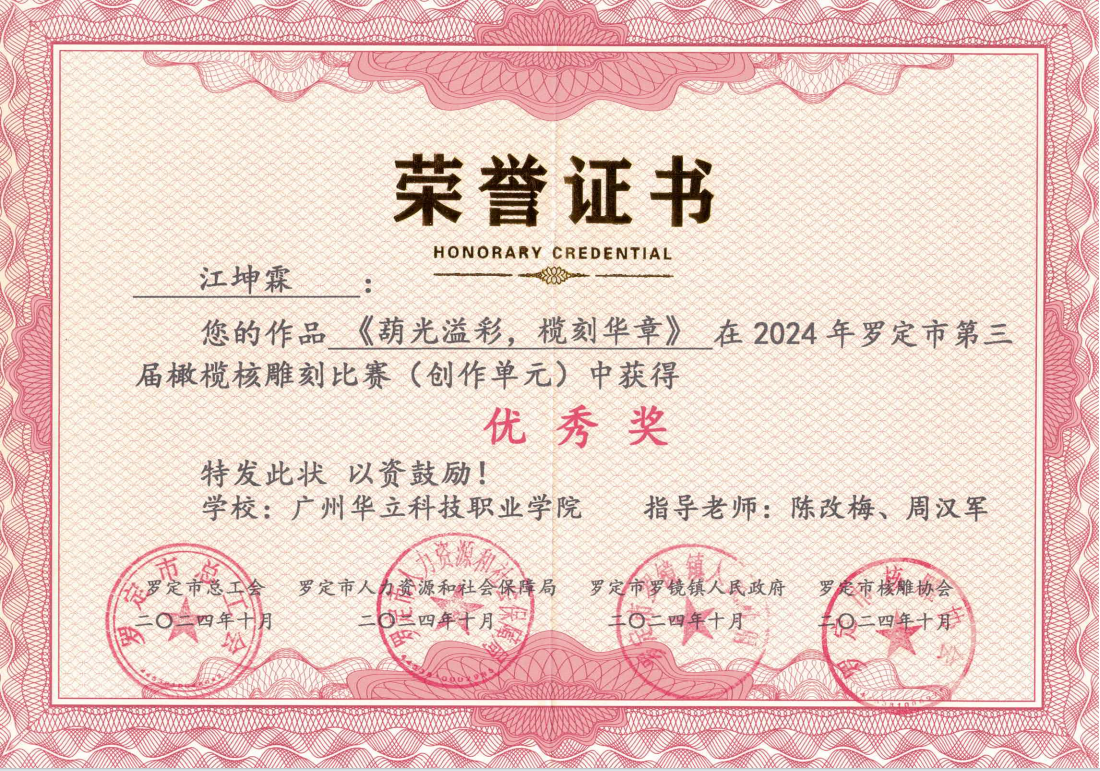 微雕世界,大美云浮,由云浮市人力资源和社会保障局、罗定市总工会、罗定市人力资源和社会保障局、罗定市罗镜镇人民政府主办。力在深入贯彻落实党中央关于实施乡村振兴战略的决策部署,及全面推动省委省政府“百县千镇万村高质量发展工程”走深走实。本次大赛分橄榄核雕精修、橄榄核雕创作两个单元,我校师生积极参赛,并根据比赛大纲认真备赛,经过一个多月的激烈角逐,在专家评委对作品艺术特色、工艺手法技巧、艺术创意水平、形象空间美感等多方位的严格评选及网络投票综合评比下,我校师生在此次比赛中荣获三等奖1项、最佳创意奖1项以及优秀奖6项的优异成绩。这不仅是对师生精湛技艺的肯定,更是对我校在美育艺术教学和研究方面所取得成果的认可。