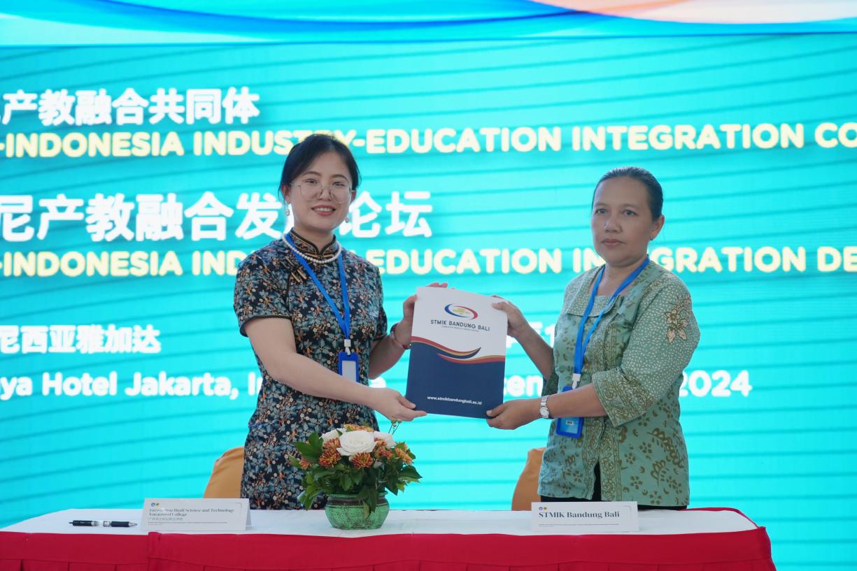 最后,国际交流中心刘婕副主任代表我校作为中国首批合作院校之一,与共同体中的巴厘岛万隆信息技术学院校长签署MOU合作协议,并将我校中国优秀烹饪文化“粤菜师傅”培训基地牌匾交给共同体代表,希望在未来能将更多的中国优秀特色文化通过“职教出海”与“一带一路”带出国际,全面搭建中印尼国际交流平台,让我校更多的学生和教职工能站在国际舞台上发挥所长。