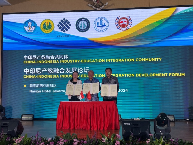 三位发起单位代表共同签署“中印尼产教融合共同体”的合作文件