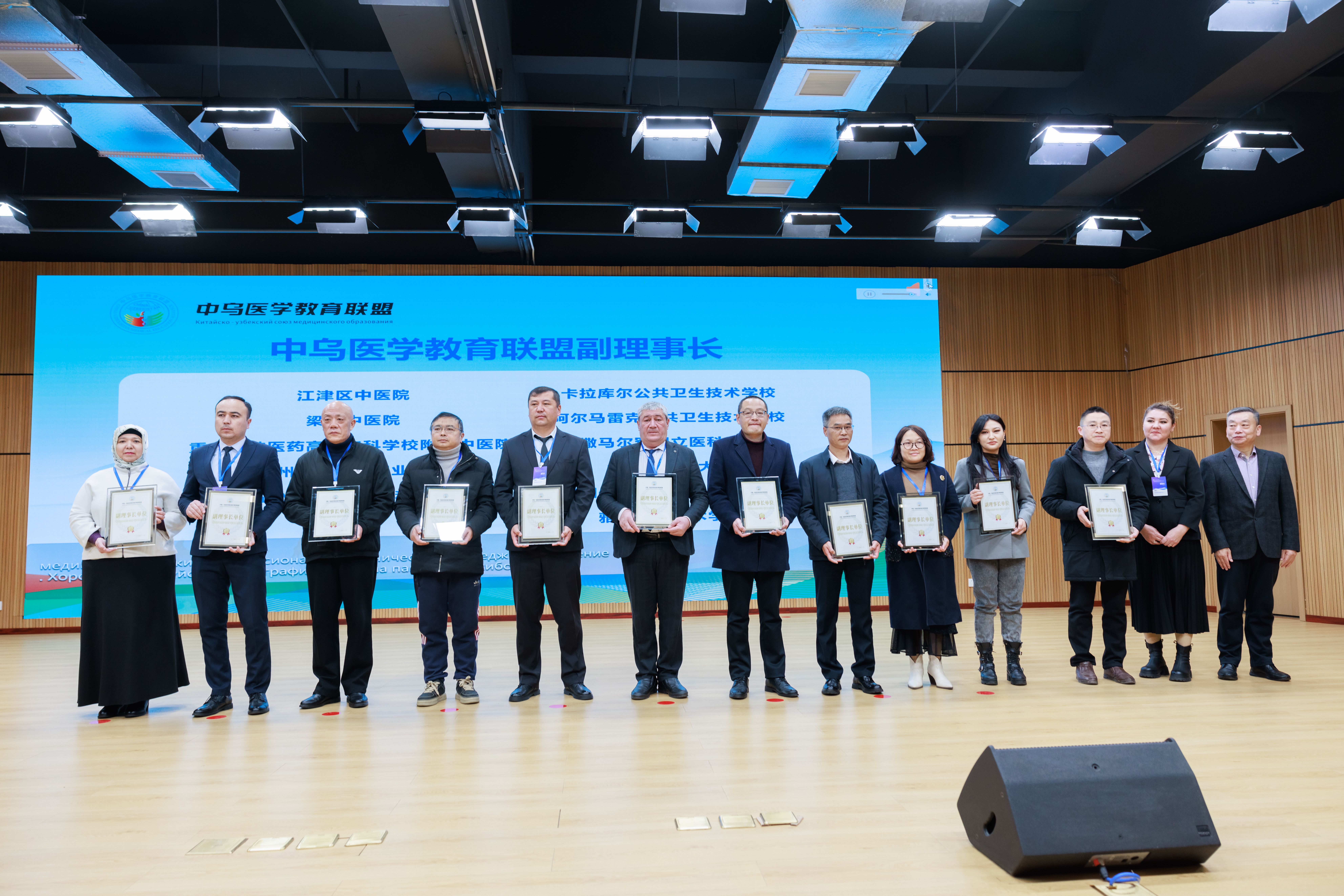 随后大会举办了中乌医学教育联盟成立揭幕仪式,在仪式上宣布了中乌医学教育联盟理事长、副理事长、理事单位名单并现场授牌。我校在联盟中被授予副理事长单位,马俊常务副校长代表上台领取授牌。