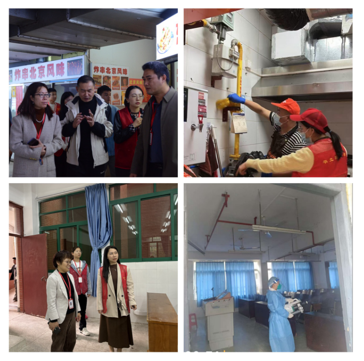 校领导带领总务处工作人员检查教室、食堂、燃气等情况并进行清洁和消杀