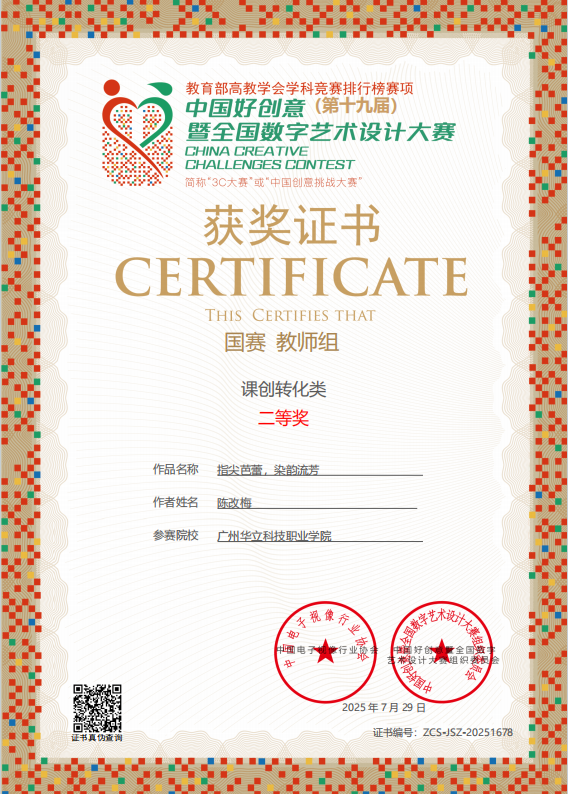 一直以来,学校领导高度重视教师队伍的专业发展和教学水平提升,积极为教师们搭建学术交流、竞赛锻炼的平台,定期组织培训与研讨,鼓励教师参与各类专业竞赛与学术研究,营造了浓厚的学术氛围和良好的创新环境。此次喜获佳绩,不仅是对教师个人能力的肯定,更是学校持续推进教学改革与产教融合发展的生动体现。未来,学校将持续深化数字艺术领域的教学改革与科研探索,搭建更广阔的师生发展平台,激励更多教育工作者与学子在艺术与科技的融合之路上勇于突破、再创佳绩,助力学校高质量发展。