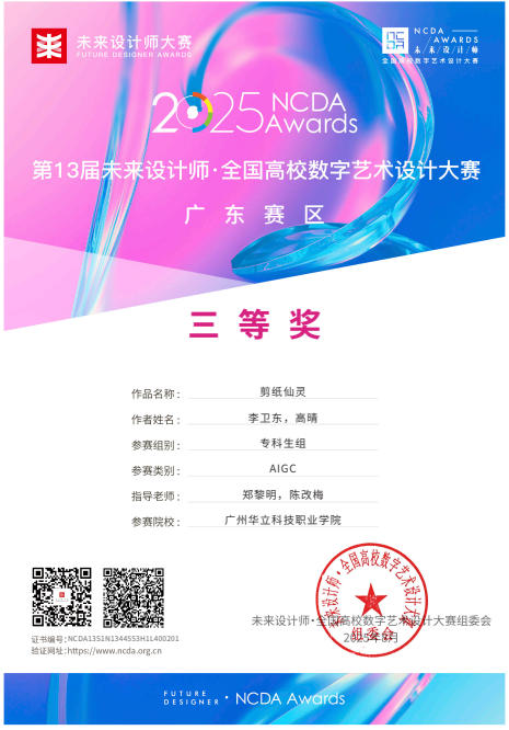 在2025年举办的第13届未来设计师·全国高校数字艺术设计大赛(NCDA)中,艺术与传媒学院师生凭借其卓越的创意和精湛的技术,荣获多项大奖。未来设计师·全国高校数字艺术设计大赛(NCDA)是入选《全国普通高校大学生竞赛排行榜》,近20家省教育厅认定,“学习强国”学习平台支持,对接联合国国际赛的全国性大学生竞赛。是高校教育教学改革和创新人才培养的重要竞赛项目之一,具有极高的知名度与影响力。本次大赛是由全国高校数字艺术设计专业委员会主办,旨在挖掘和培养数字艺术设计领域的未来之星,大赛已连续举办13届,为艺术设计领域的高水平知名赛事,是我院师生积极参与的重要专业竞赛之一。