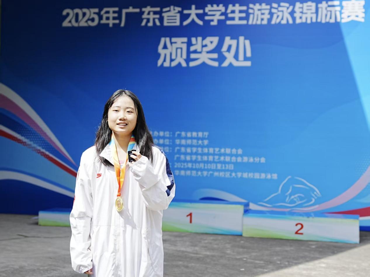 本次赛事,由教育学院余悦强和谭艳艳老师率队参赛。在丙组女子100米蛙泳决赛中,我校生活学院莫芷荧同学面对来自全省20余所高校的强劲对手,开局便凭借出色的入水节奏占据优势,途中游阶段始终保持稳定的划水频率与呼吸节奏,最后25米全力冲刺,以1分24秒63的优异成绩率先触壁,斩获冠军;在随后进行的丙组50米蛙泳决赛中,她延续良好竞技状态,以38秒30的成绩获得亚军,一人独揽两枚奖牌,为学校赢得荣誉。