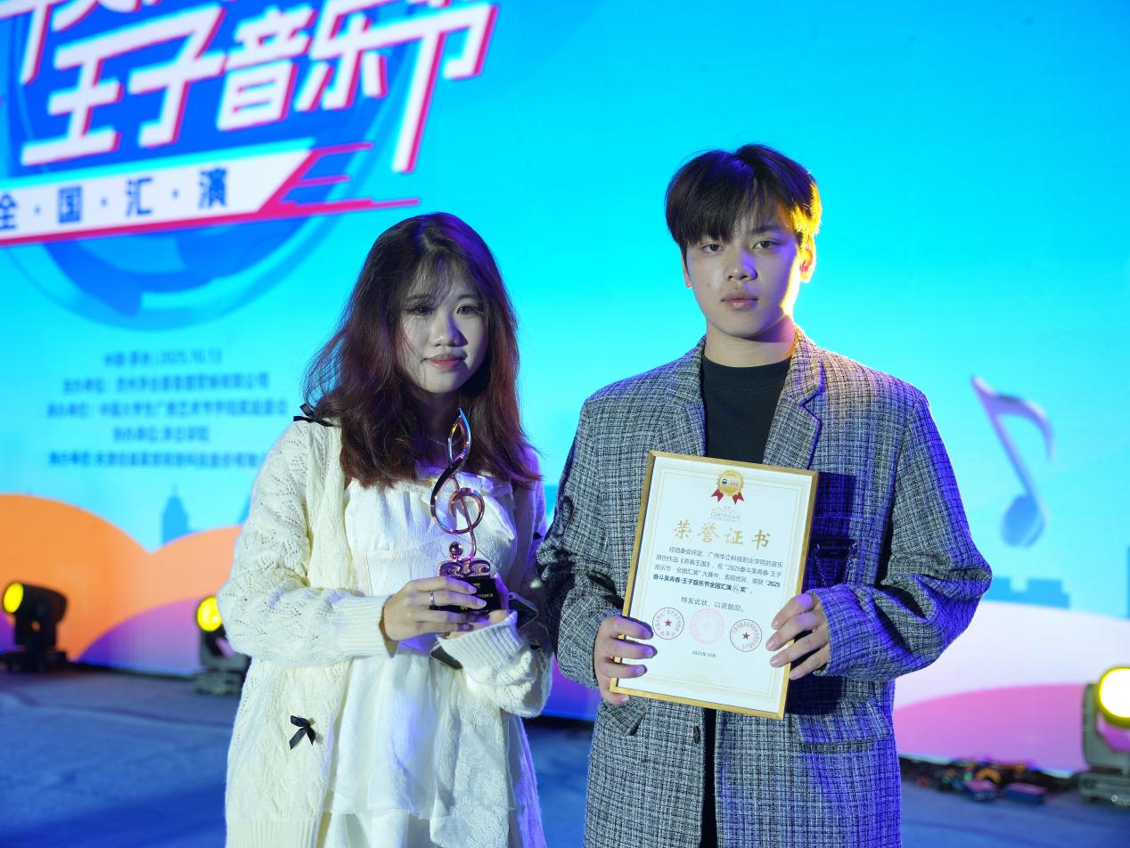 近日,由贵州茅台集团主办、中国大学生广告艺术节学院奖组委会承办的2025“奋斗美青春·王子音乐节”全国汇演在茅台学院盛大举行。广州华立科技职业学院校长廖俊杰、常务副校长马俊、艺术与传媒学院院长朱君受邀出席本次活动。我校学生关梓峰、张钡钡的原创音乐作品《青春王国》荣获2025“奋斗美青春·王子音乐节”原创音乐作品铜奖,同时学校还斩获产教融合校企实践铜奖,充分展现了我校在艺术教育与产教融合领域的实践成果。