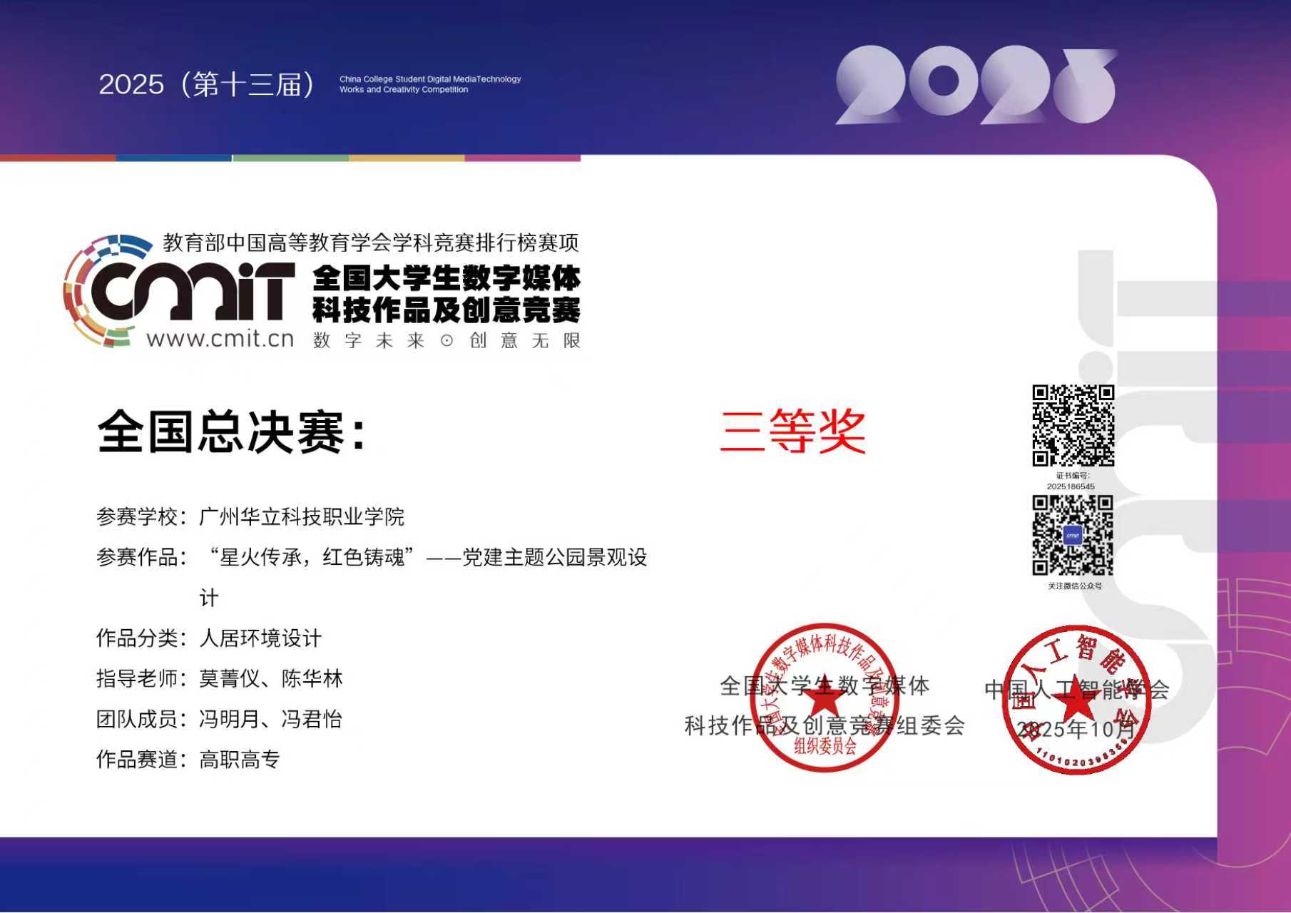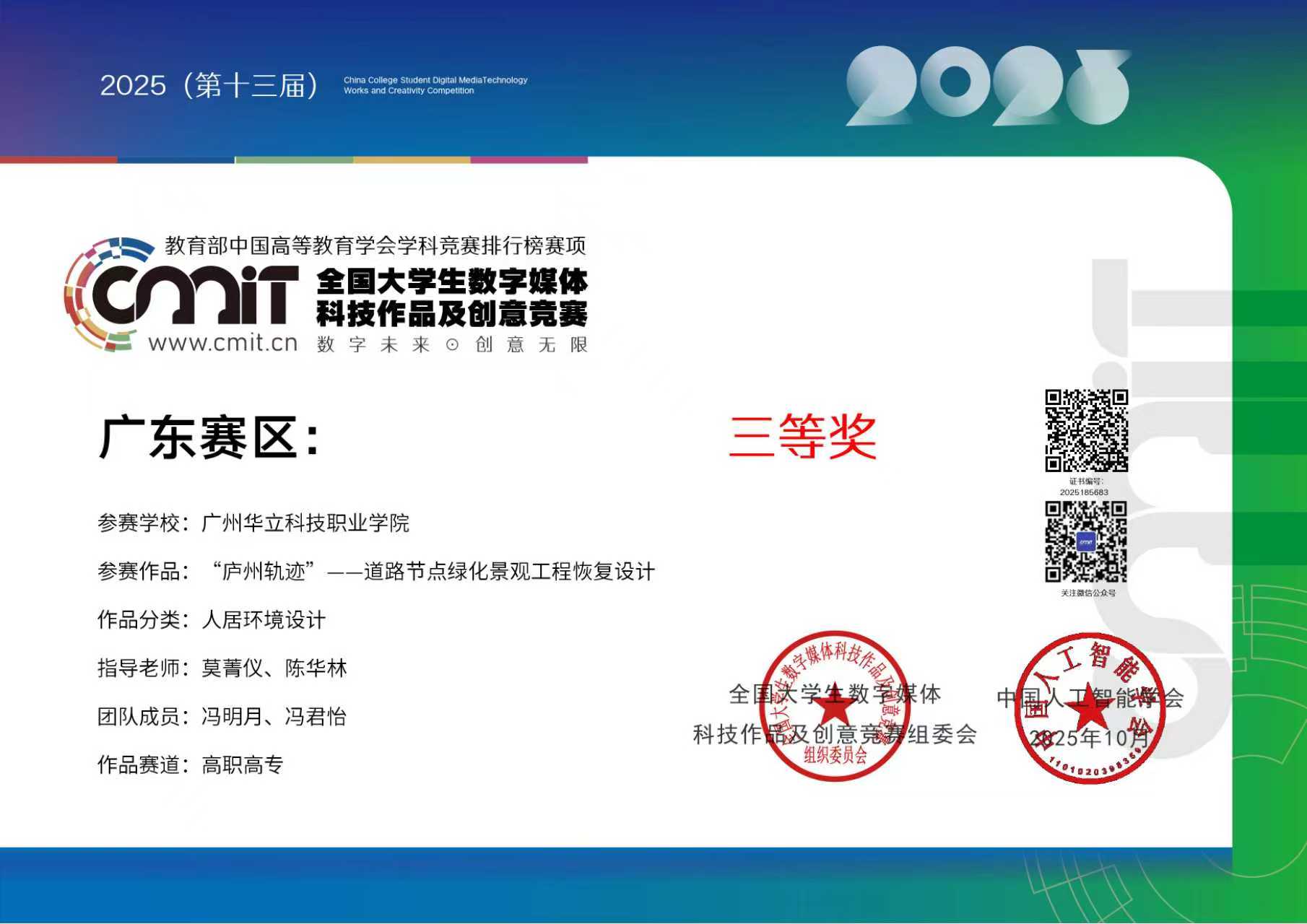 其中,由程若愚、莫菁仪、陈华林老师指导,陈佳怡、冯明月等同学完成的作品《屿光别院-乡村民宿设计》、《星火传承,红色铸魂”--党建主题公园景观设计》在全国大学生数字媒体科技作品及创意竞赛全国总决赛中荣获三等奖2项,广东赛区中获二等奖2项;由田娅娟、莫菁仪、陈华林老师指导,何颖诗、冯君怡等同学完成作品《池上幽居静寄山庄池上居复原与改造设计》、《“庐州轨迹”--道路节点绿化景观工程恢复设计》荣获广东赛区三等奖2项。