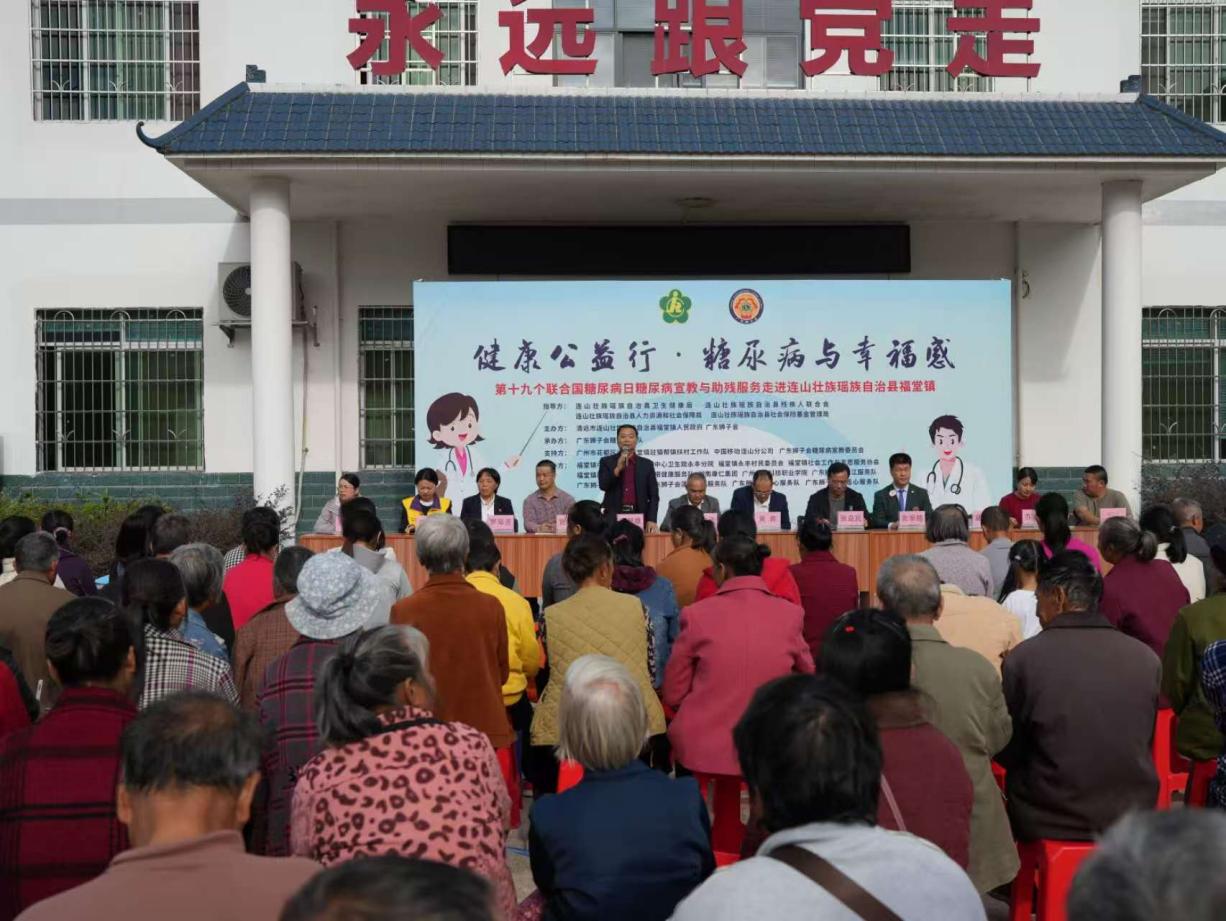 2025年11月14日是第十九个世界糖尿病日,广州华立科技职业学院健康学院省级农村科技特派员团队在清远市连山壮族瑶族自治县福堂镇永丰村开展药食同源与健康科普宣讲筛查活动,一场以“健康公益行-糖尿病与幸福感”为主题的大型糖尿病宣讲科普、扶残助残活动成功举办。活动现场设置了无创测血糖、AI眼底筛查、AI中医体验等丰富多样的环节,吸引了超600名村民参与,活动得到了福堂镇人民政府的充分肯定与赞誉。